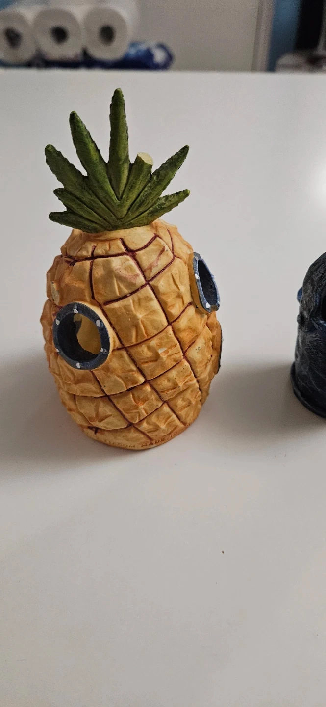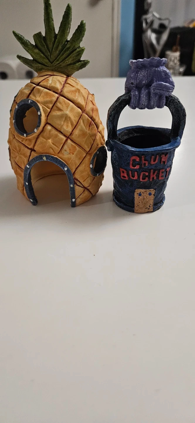 This set features a pineapple house, similar to SpongeBob's home, and a miniature Chum Bucket. Both pieces are designed for decorative display or play. They're made from a durable resin material.
