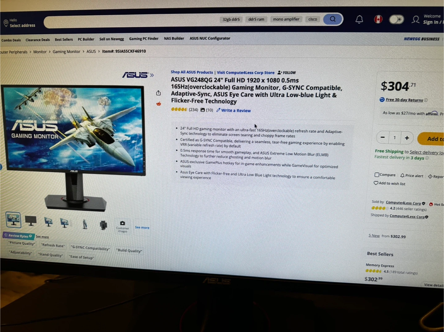 ASUS VG248QG 24" Full HD 1920 x 1080 0.5ms 165Hz(overclockable) Gaming Monitor, G-SYNC Compatible, Adaptive-Sync, ASUS Eye Care with Ultra Low-blue Light & Flicker-Free Technology