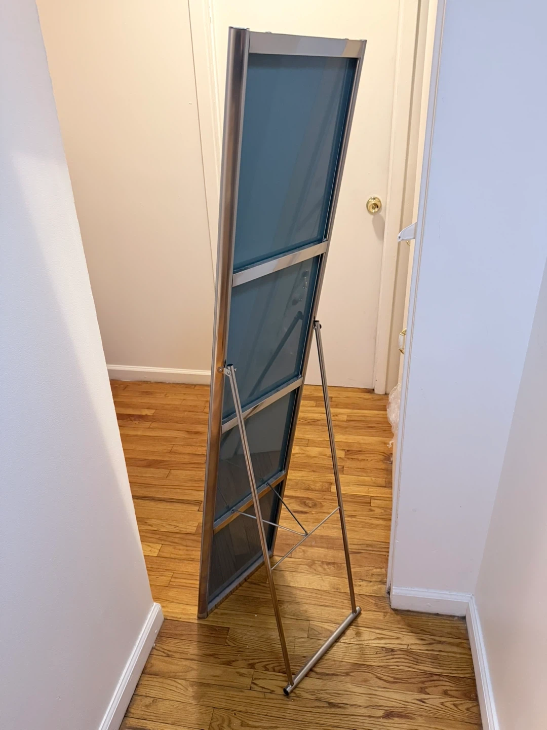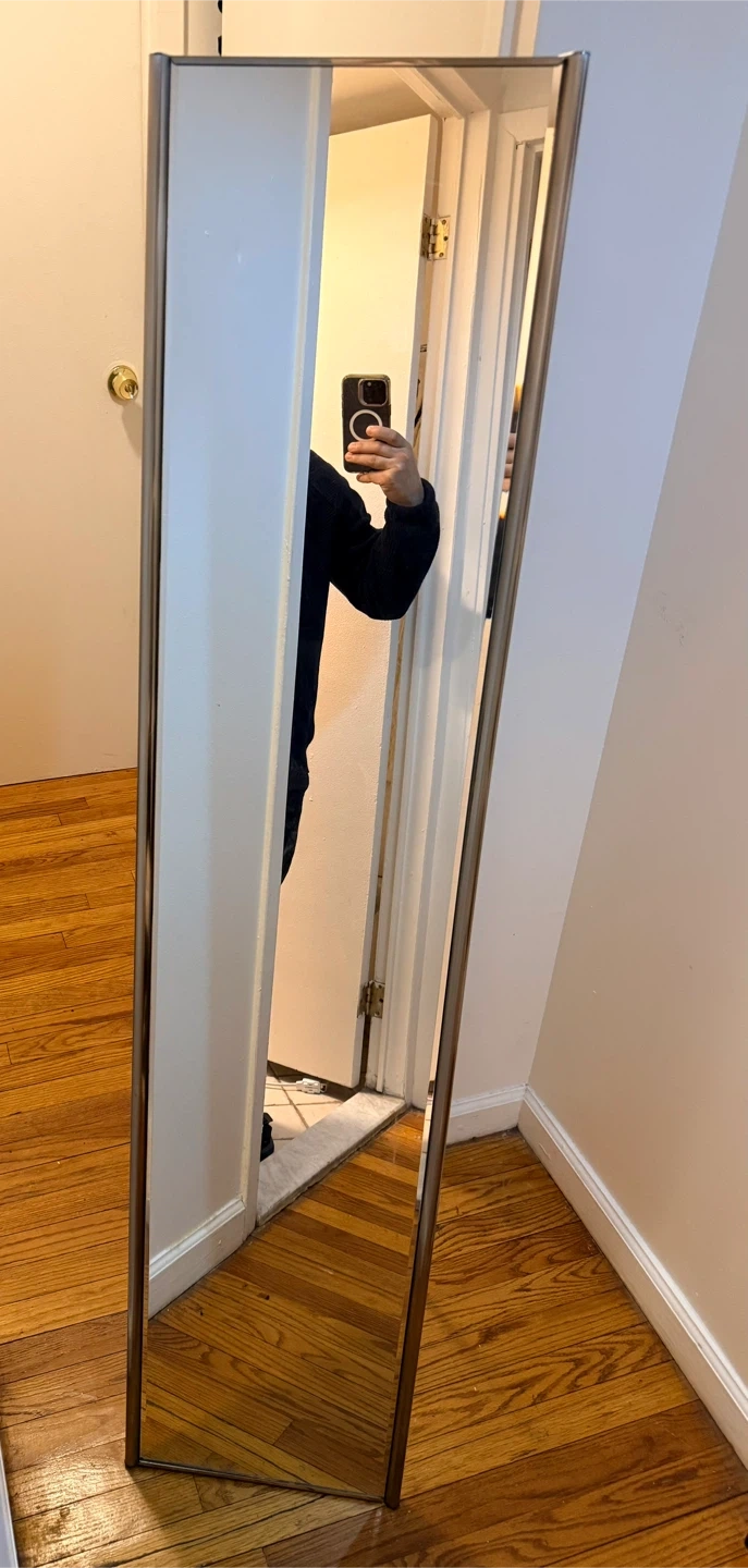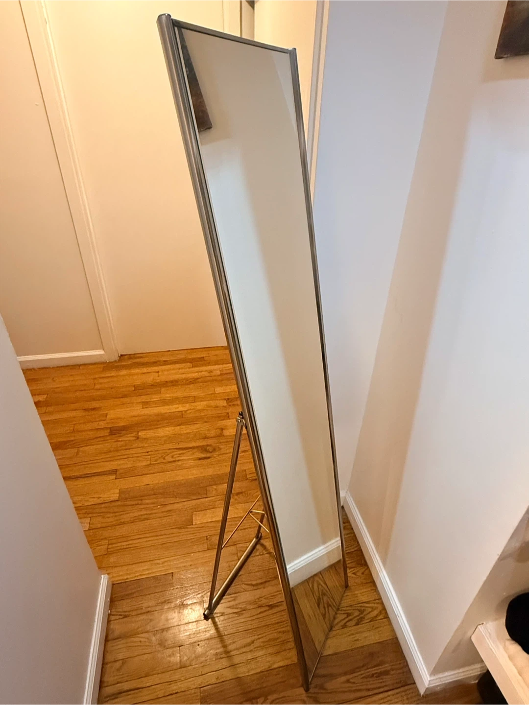 This is a full-length standing mirror. It features a slim metal frame and a convenient folding stand. It's perfect for checking your outfit before heading out!