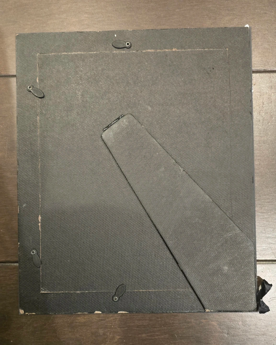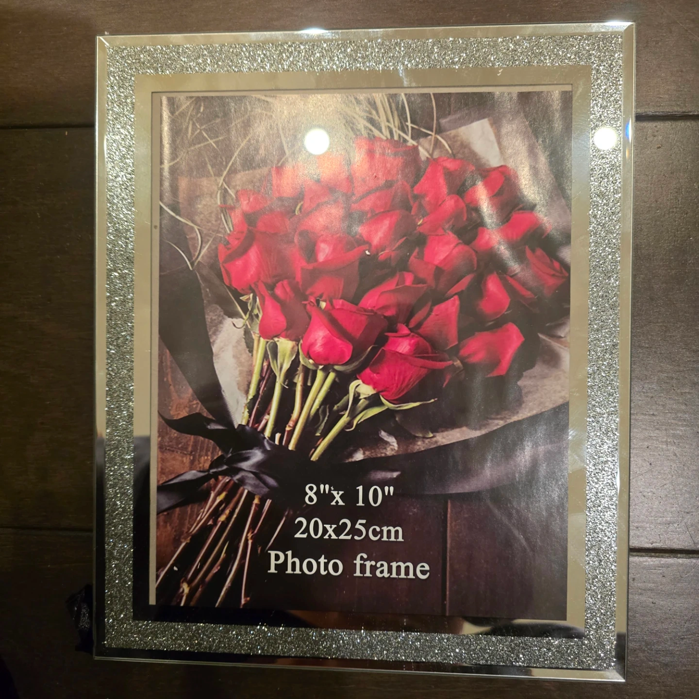 This photo frame is for 8x10 inch or 20x25cm pictures. It's designed with a sparkly, glittery border. The frame itself appears to be a silver tone. It's a nice way to display your favorite memories!