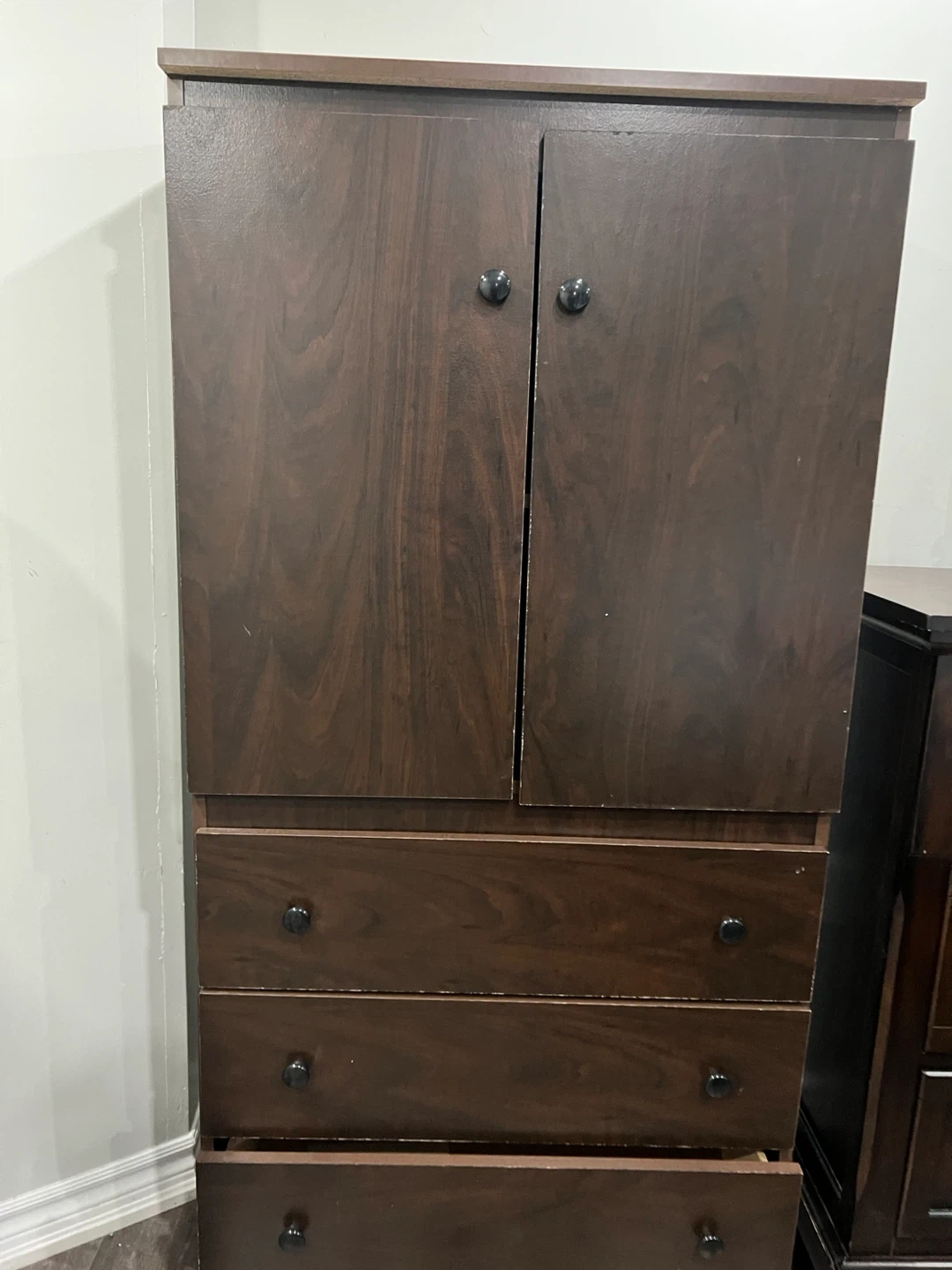 This dark wood dresser features a cabinet top with shelves, perfect for storing clothes or linens. It has three drawers below for additional storage. It's a nice piece for organizing your bedroom!