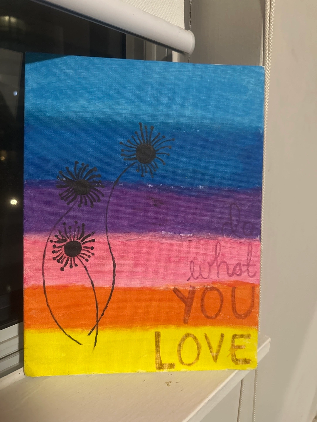 Hand-painted canvas featuring a rainbow background and black dandelion silhouettes. Inspirational quote: "Do what you love". Unique artwork, perfect for home décor.