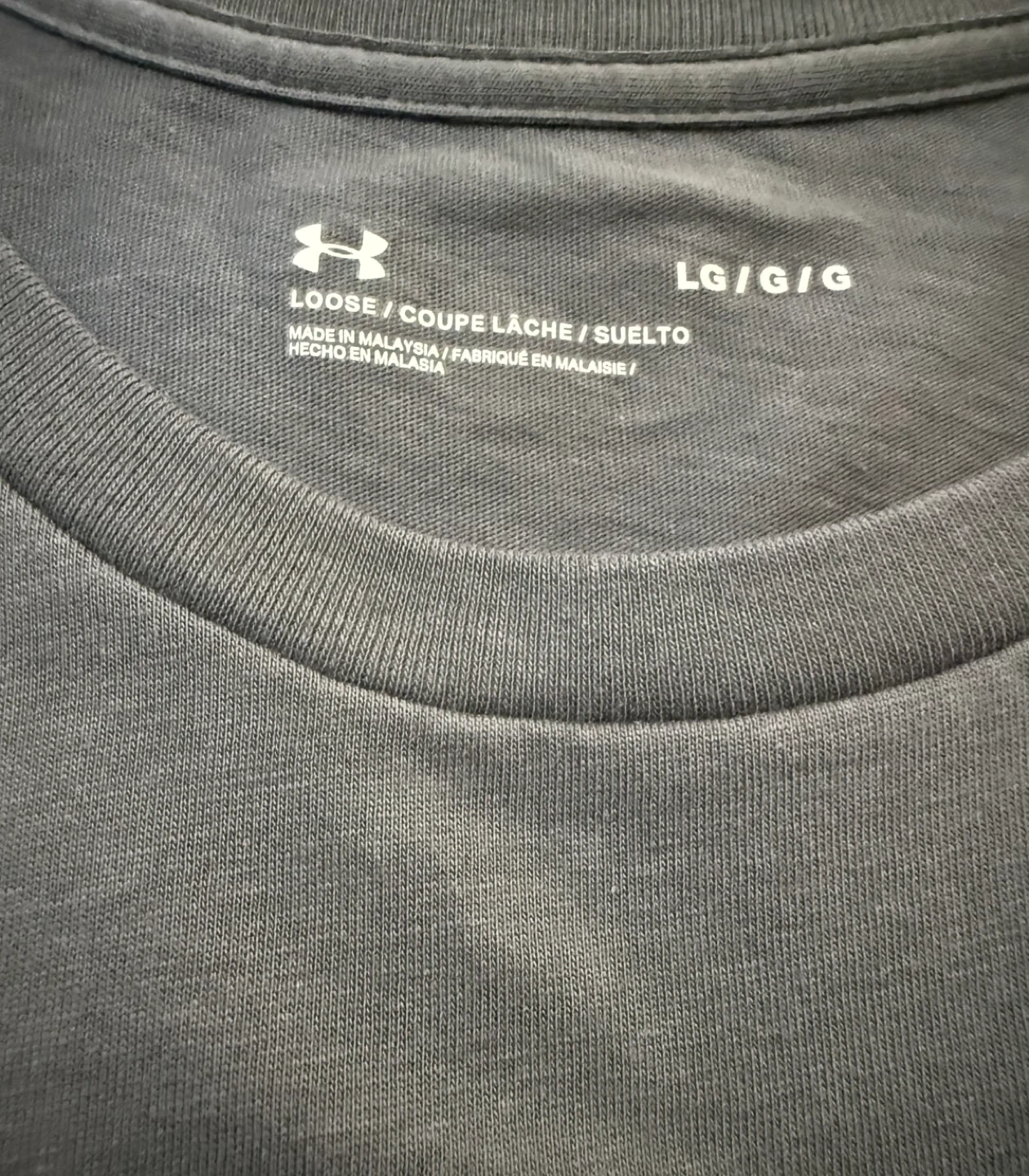 This is a grey Under Armour t-shirt in a loose fit, size large. It's made from a 60% cotton and 40% polyester blend. The shirt features a basketball-themed graphic on the front.
