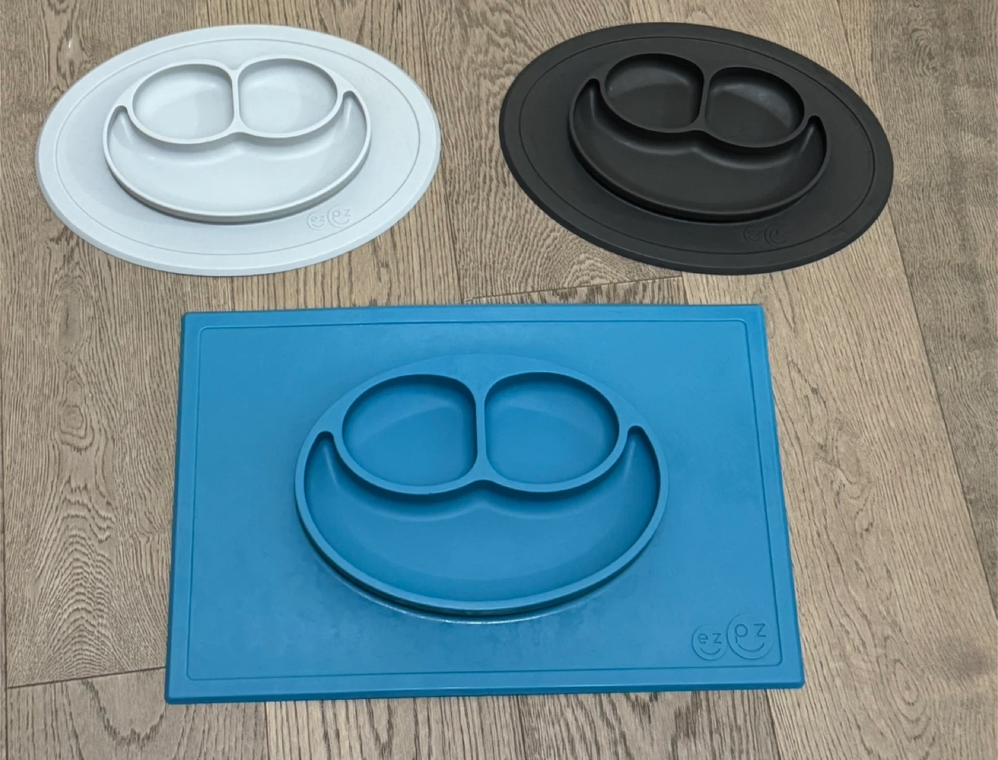 3 EZPZ silicone plates in grey, black, and blue