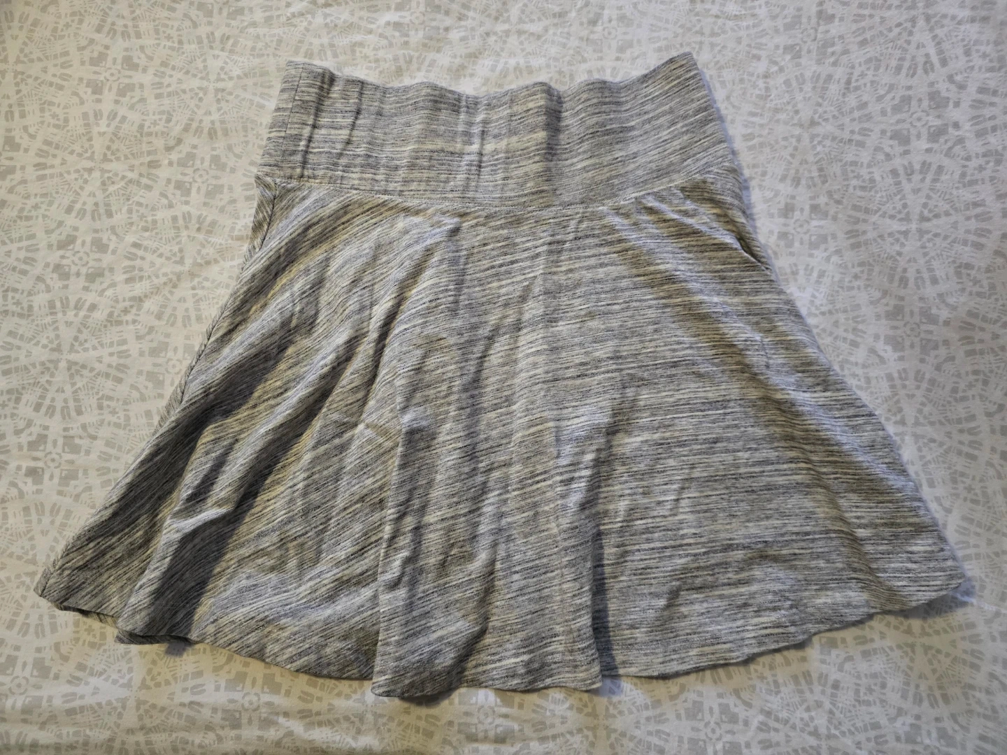 Grey, heathered, A-line skirt from Garage. Elastic waistband for comfort. Fabric is a soft, stretchy knit blend. It's a versatile piece for casual wear. Size small.