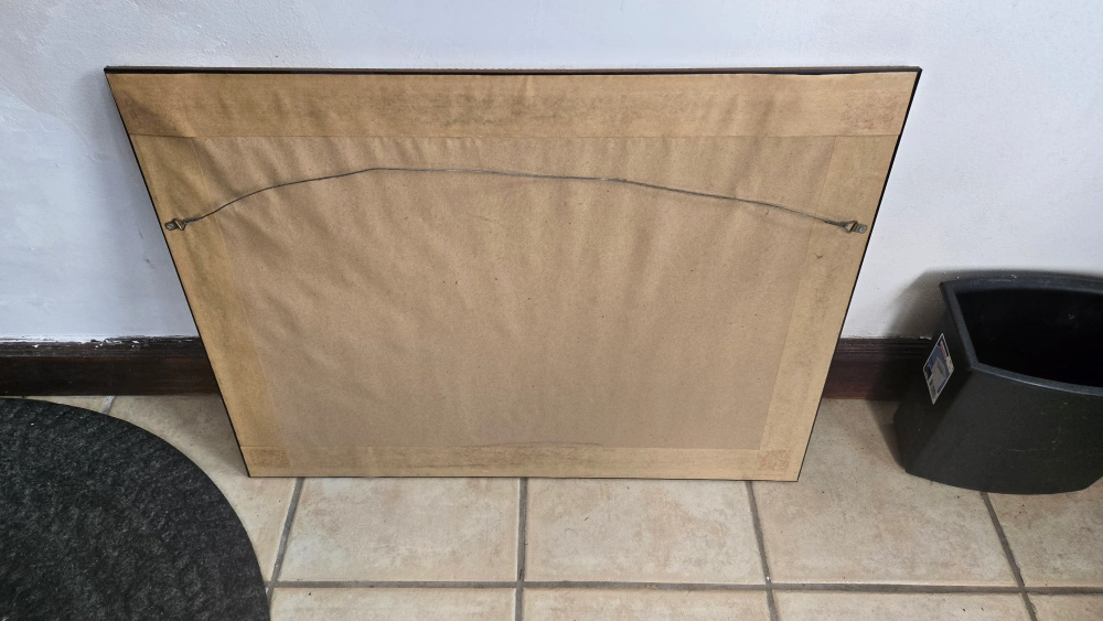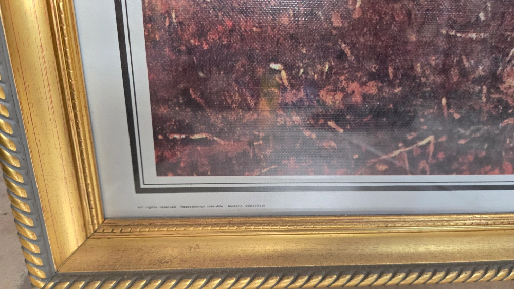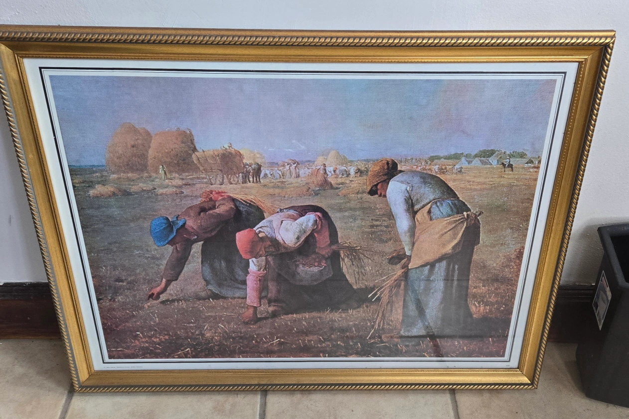 Selling a framed print of what appears to be a painting of farm workers. The frame is gold colored and in good condition. The print itself is labeled "Reproduction Interdite".