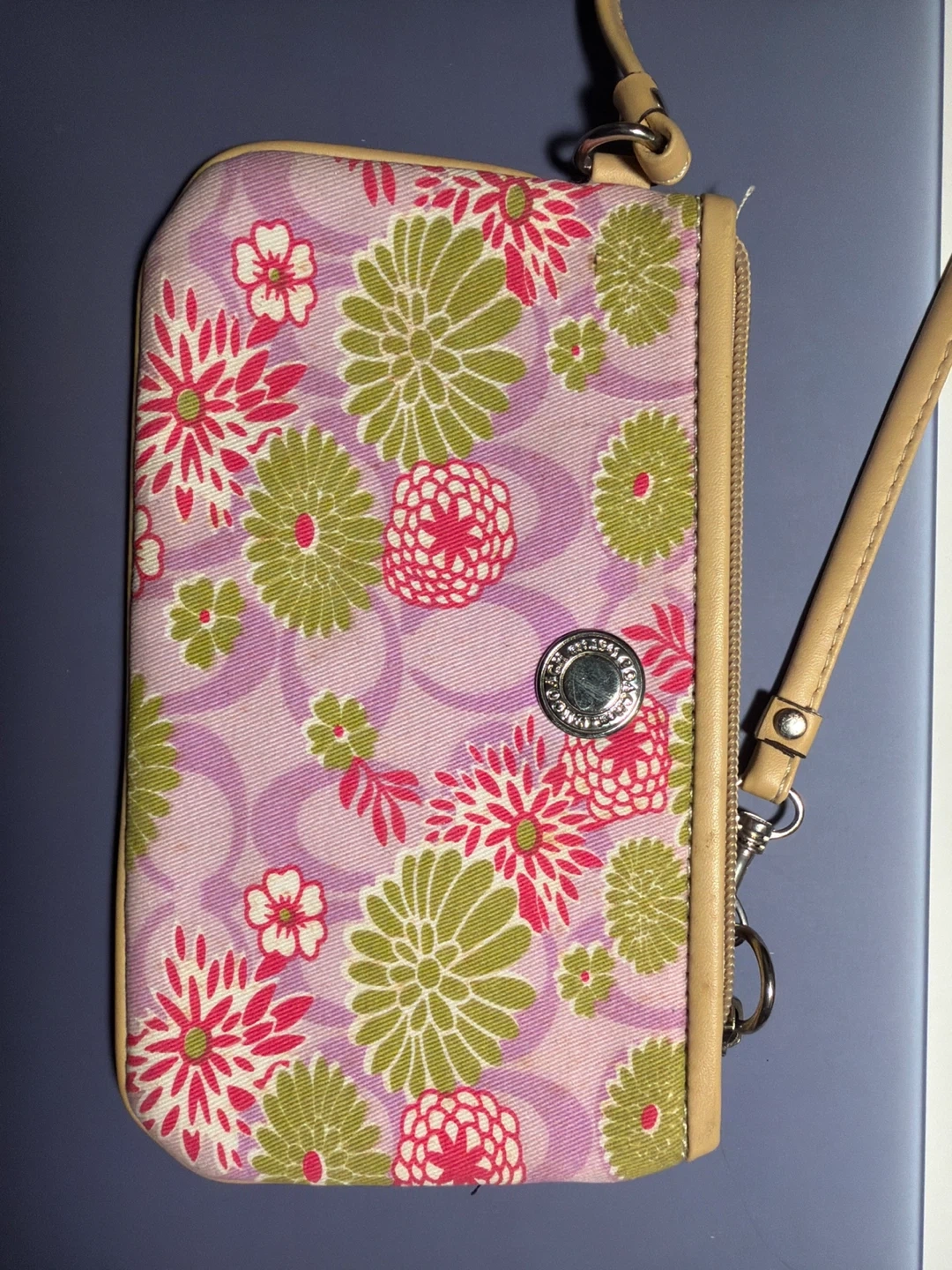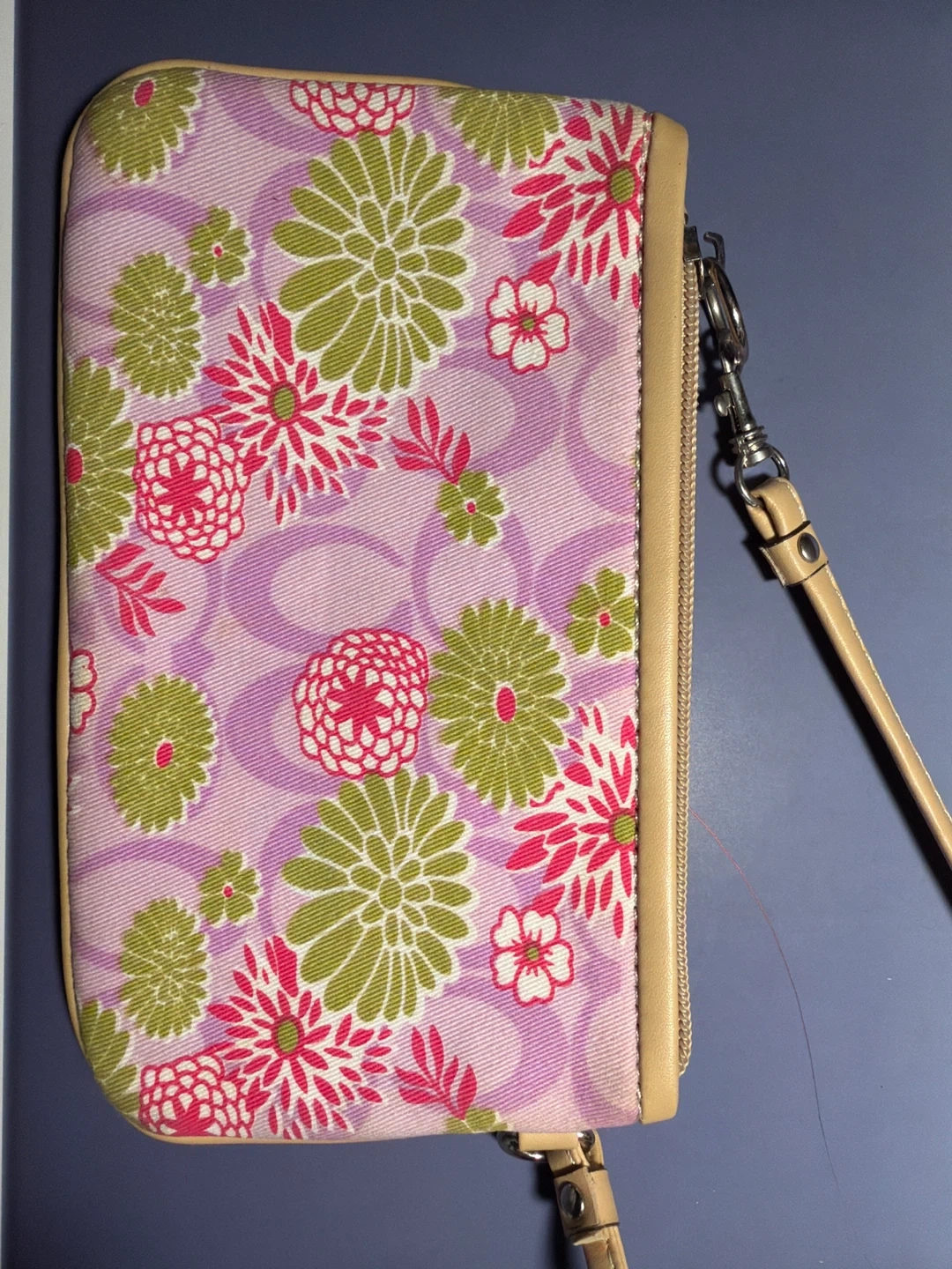This Coach wristlet pouch features a pink, green, and white floral print on a light purple background. It has tan leather trim and a wrist strap. The interior lining has a signature pattern. Zip closure.
