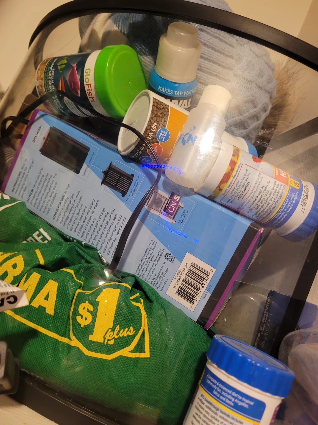 Includes GloFish fish food, Top Fin water conditioner, and a Top Fin corner filter. Also comes with color rocks