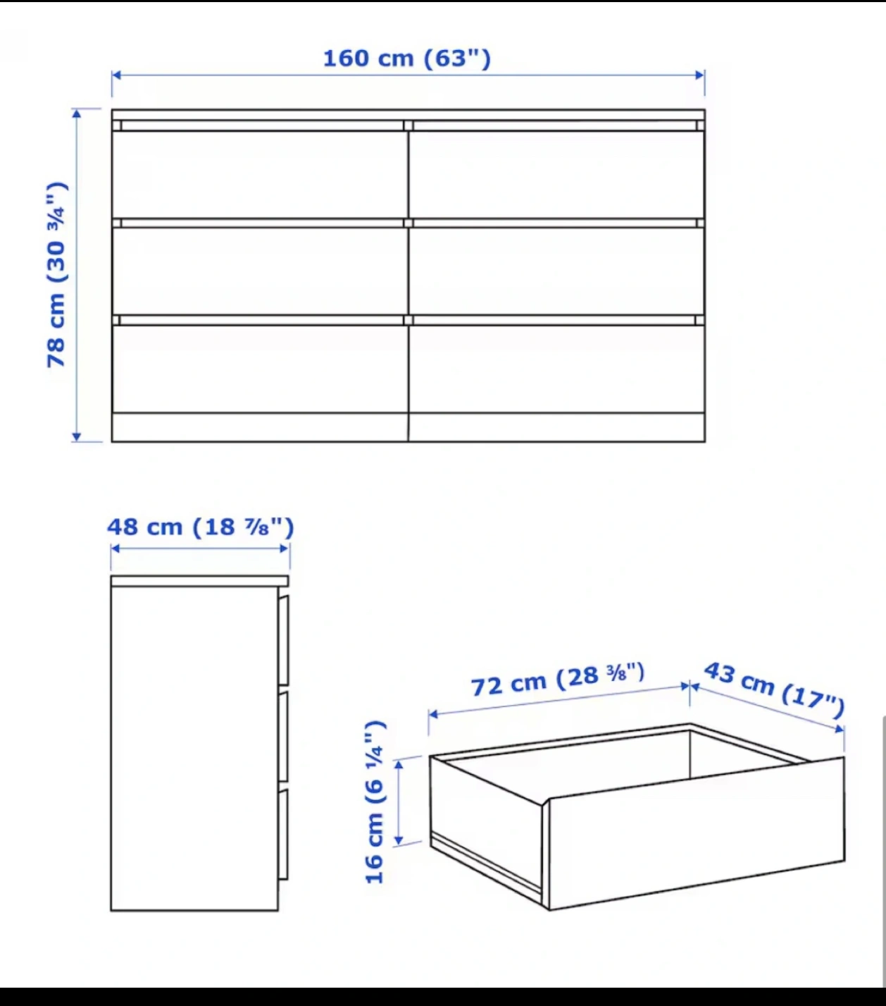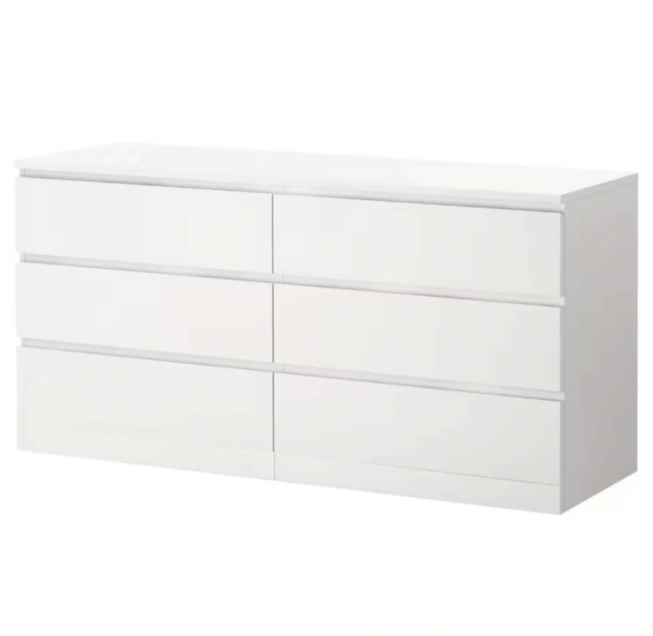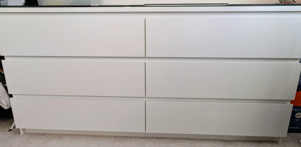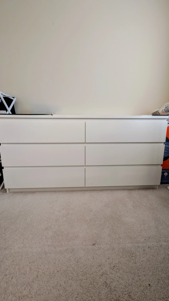White six-drawer dresser. Plenty of storage space. Great condition (hardly used) Measurements included in images. Assembled - Ready to use!