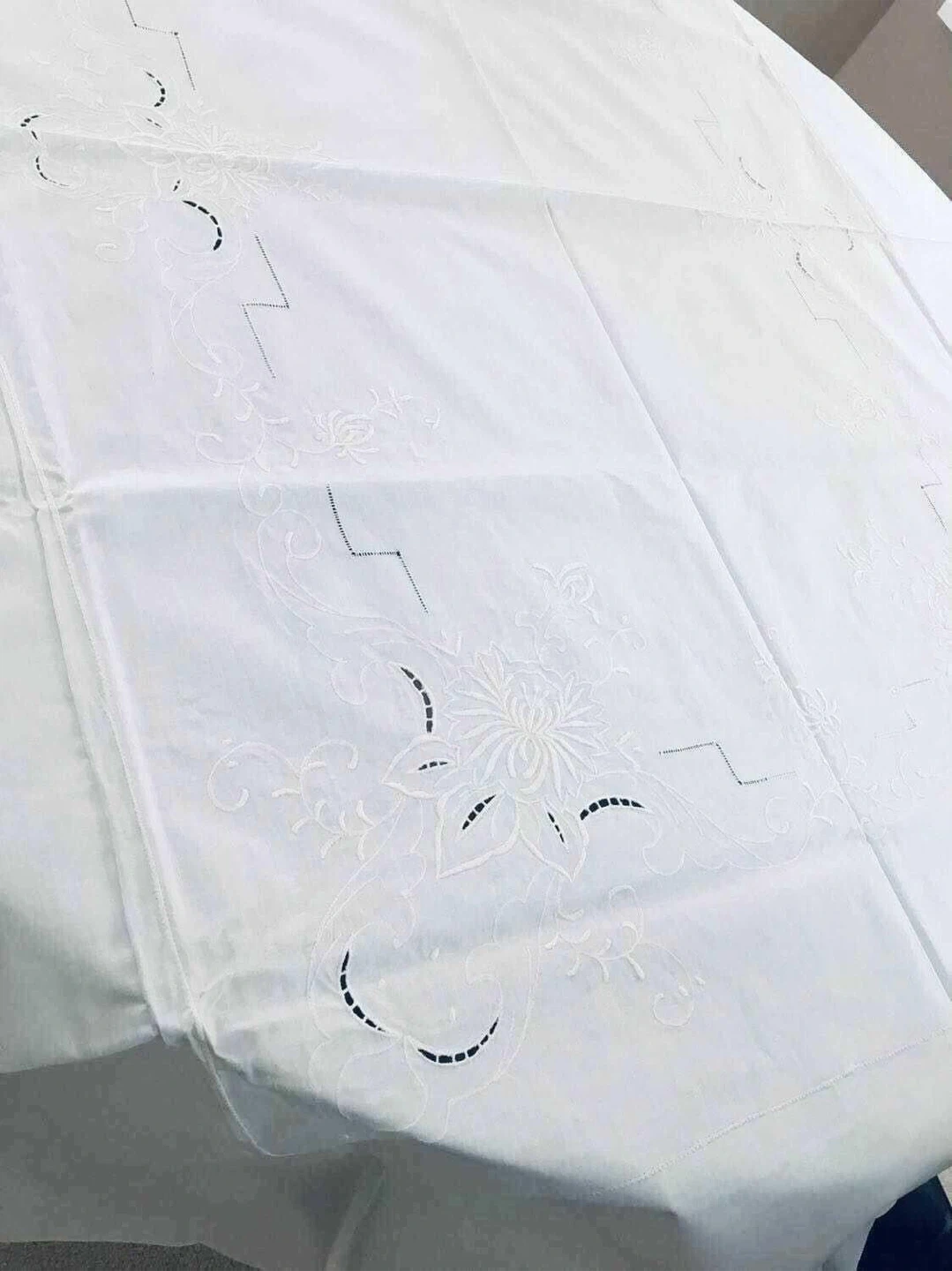 Set of white embroidered linens. Scalloped edges with delicate floral embroidery. Tablecloth is 90 inches by 72 inches