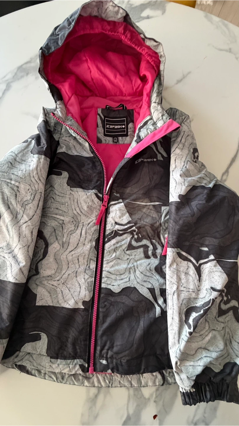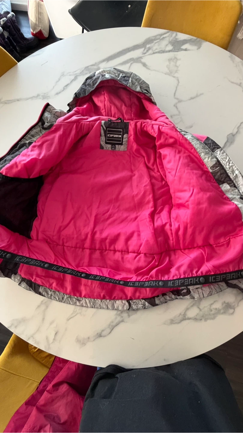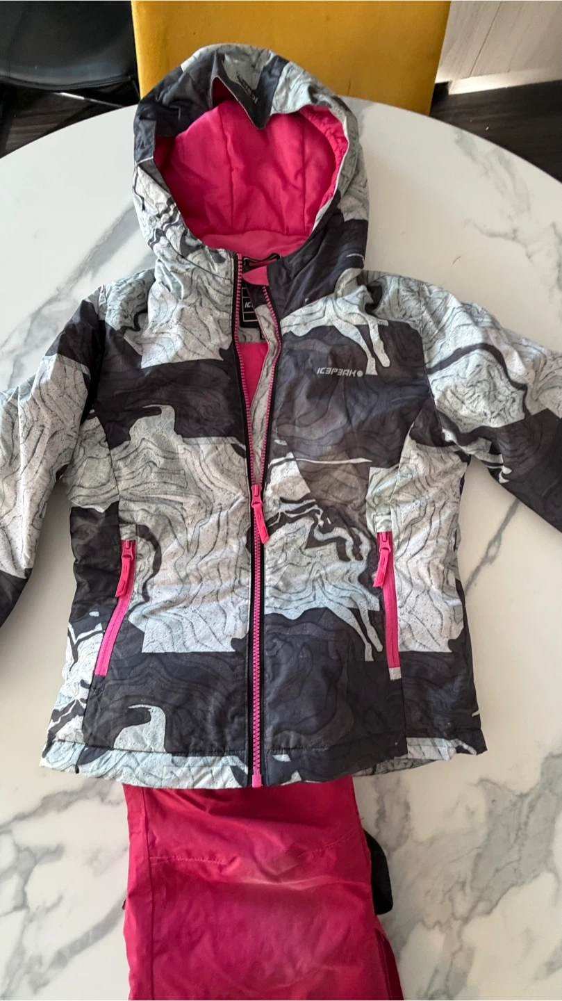 This is a kids ski jacket and pants set from Icepeak. The jacket is gray, black, and white with a pink lining. The pants are bright pink. Size is 9-10 years. This set's great for hitting the slopes!