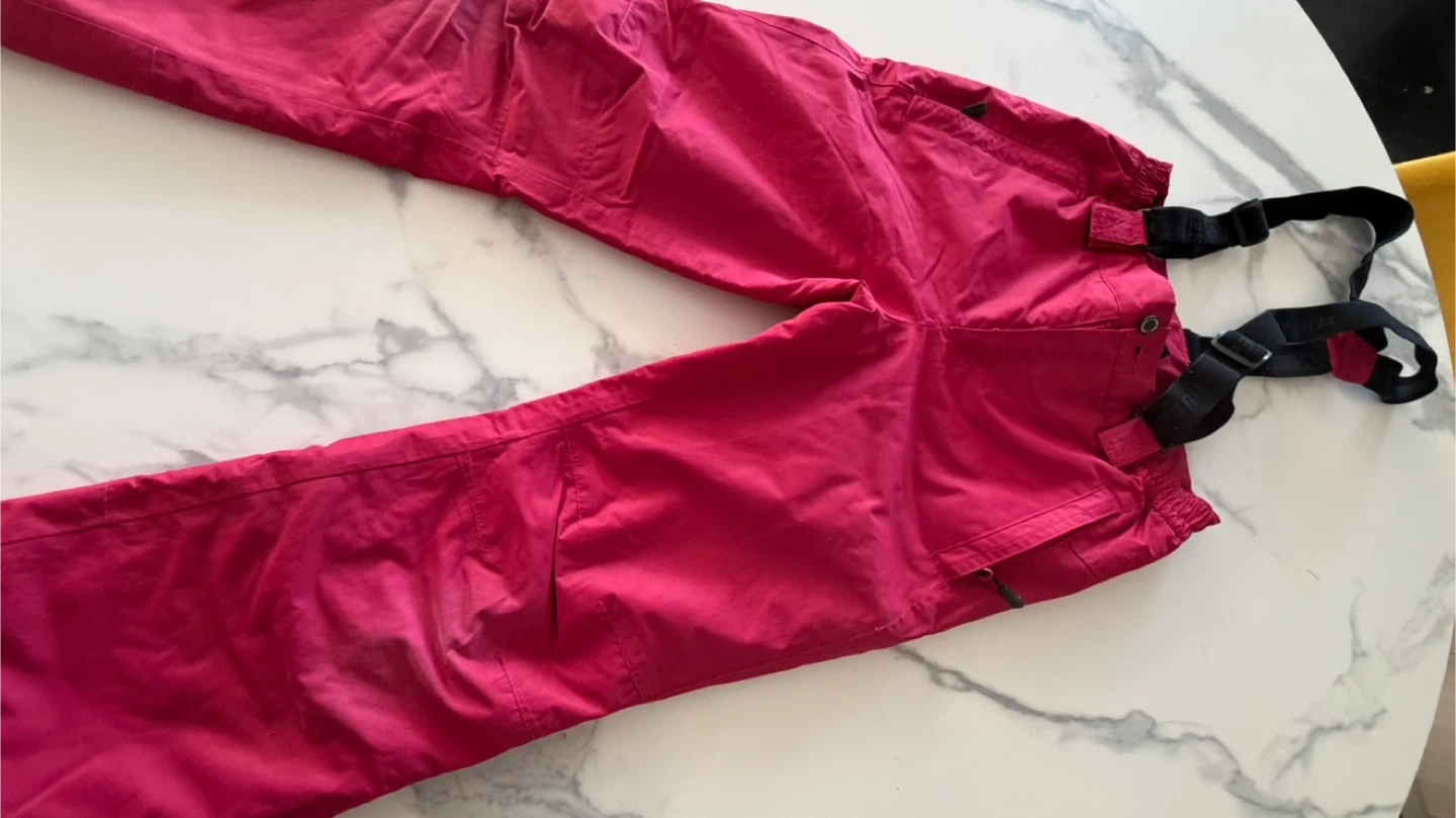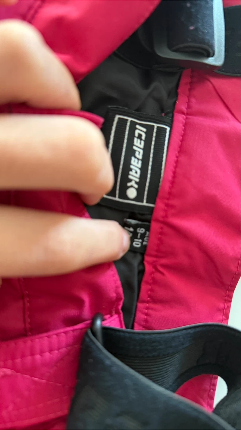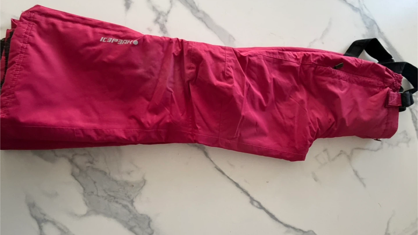 This is a kids ski jacket and pants set from Icepeak. The jacket is gray, black, and white with a pink lining. The pants are bright pink. Size is 9-10 years. This set's great for hitting the slopes!