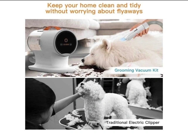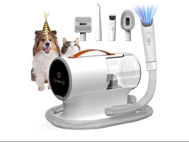 FIXR Dog Grooming Kit with 12000pa suction. Includes vacuum brush for shedding and 5 beauty tools. Comes with a 2L dust cup, operates at low noise, and has 3 levels. All parts are in perfect condition.