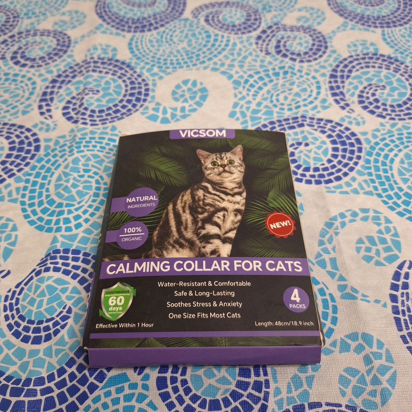 Calming collar for cats, 4 packs included. Soothes stress and anxiety. Effective within 1 hour. Collar length is 48cm/18.9 inches.