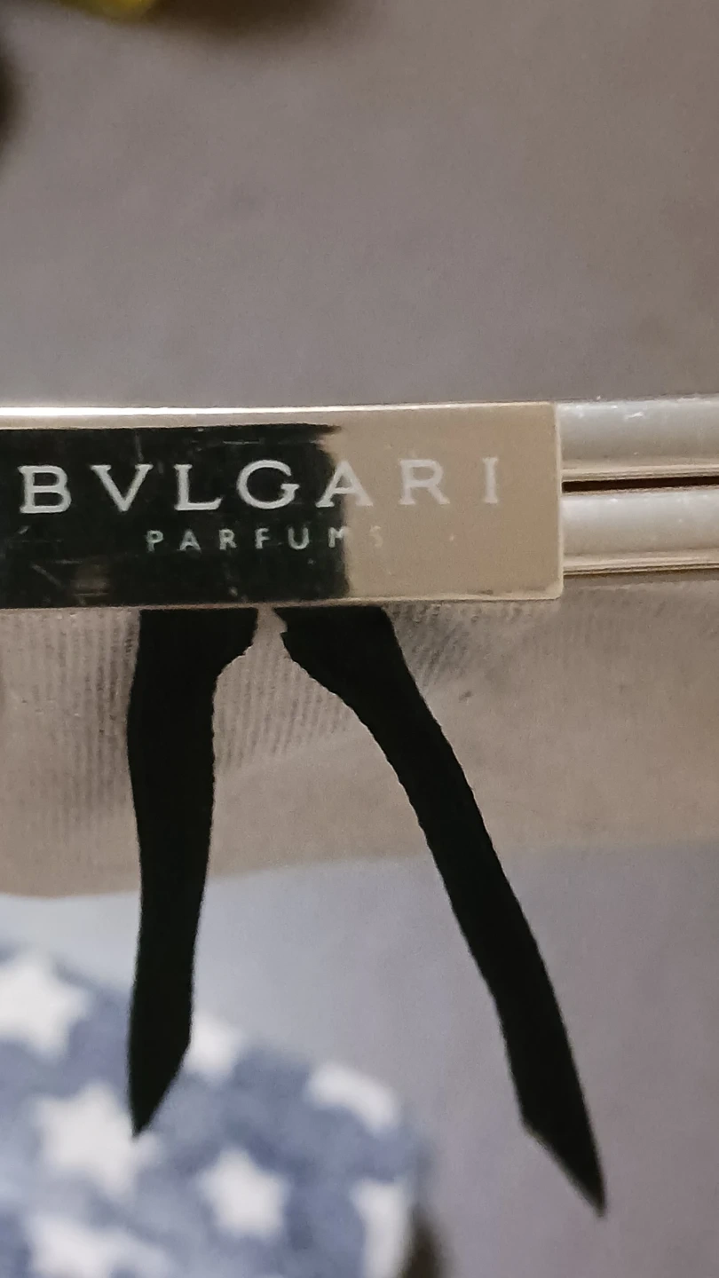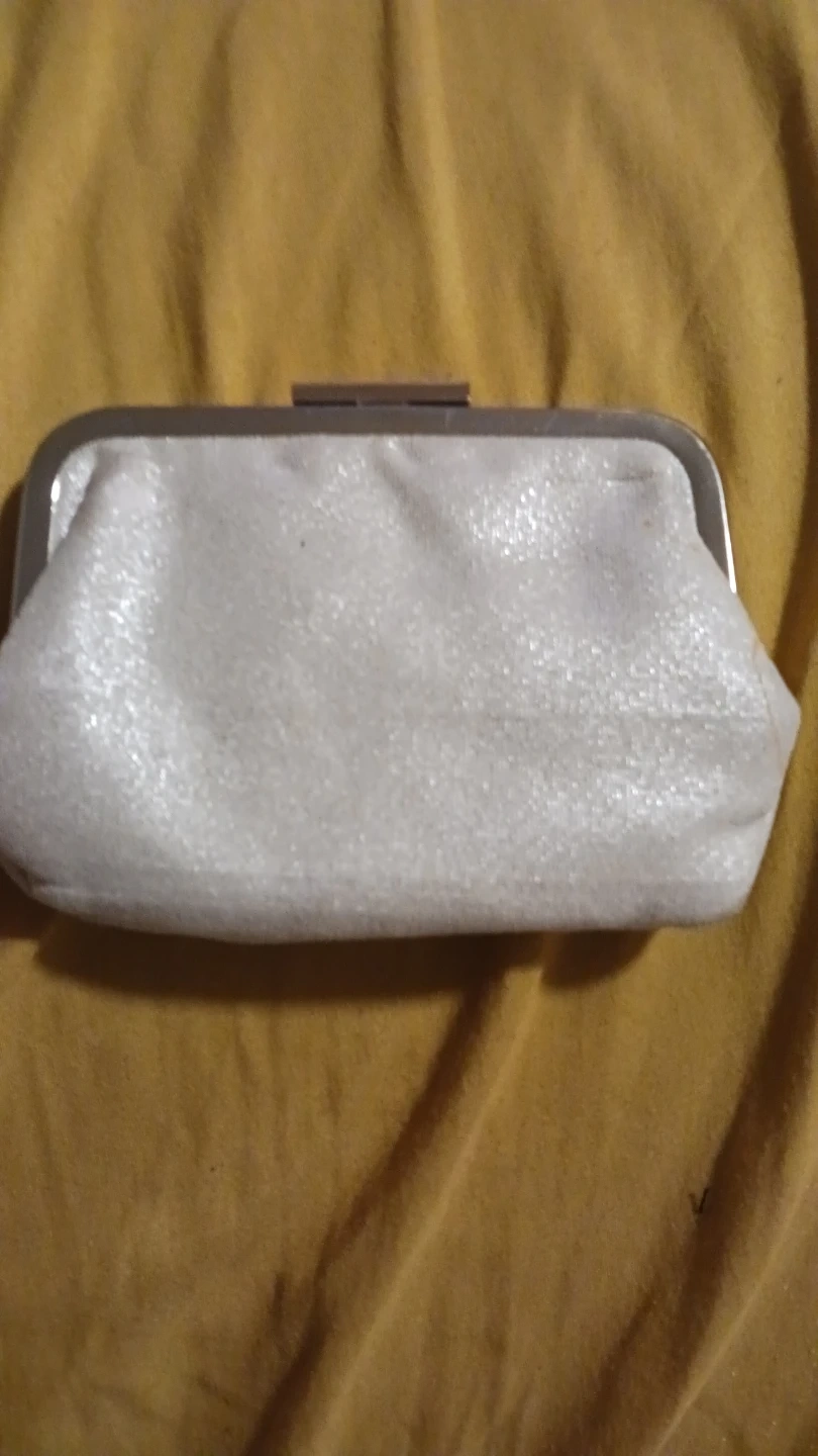 This is a Bvlgari Parfum clutch bag. It's ivory with a textured inlayed silk exterior and satin lining. Features a gold-tone clasp and a decorative black ribbon detail. Perfect for holding essentials.