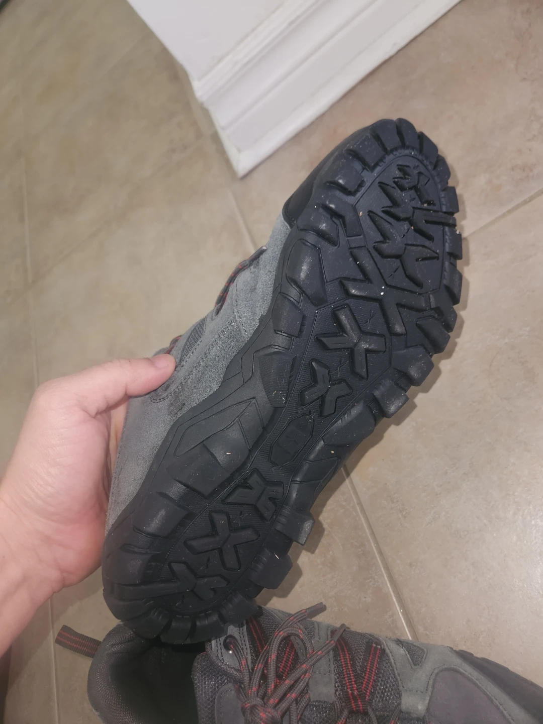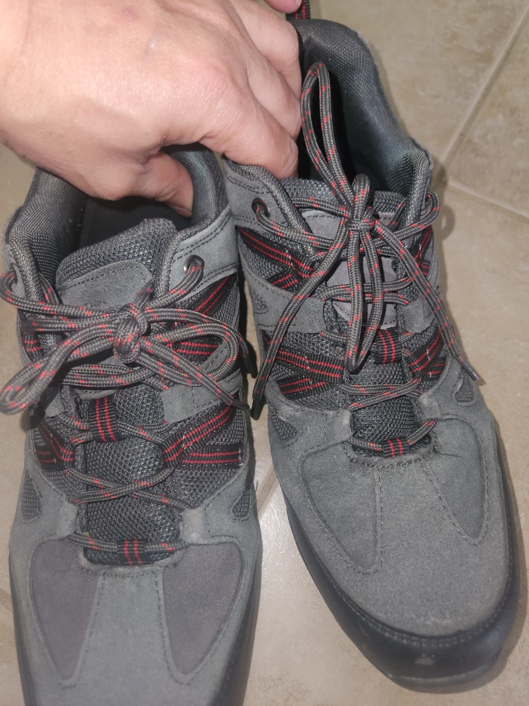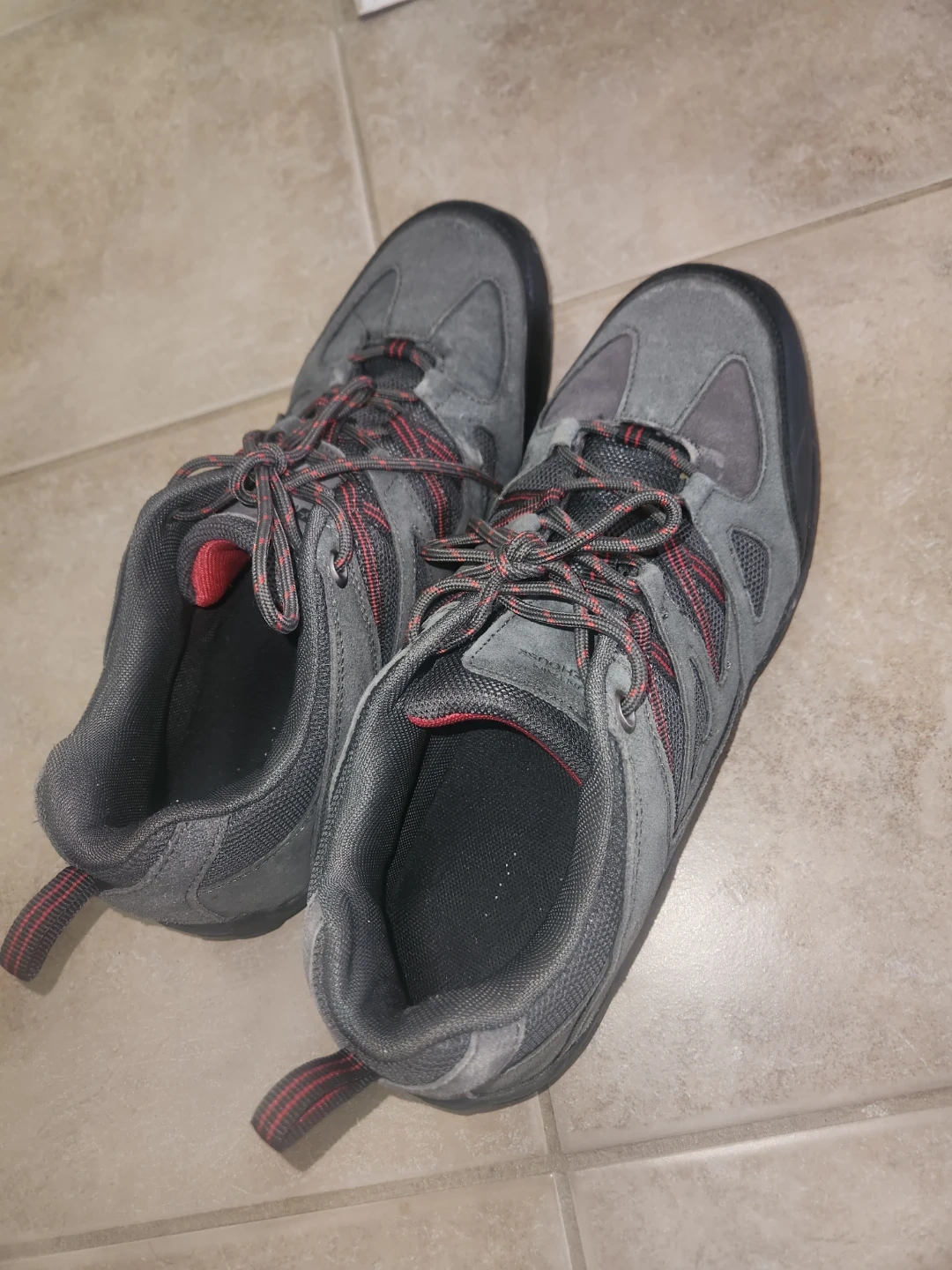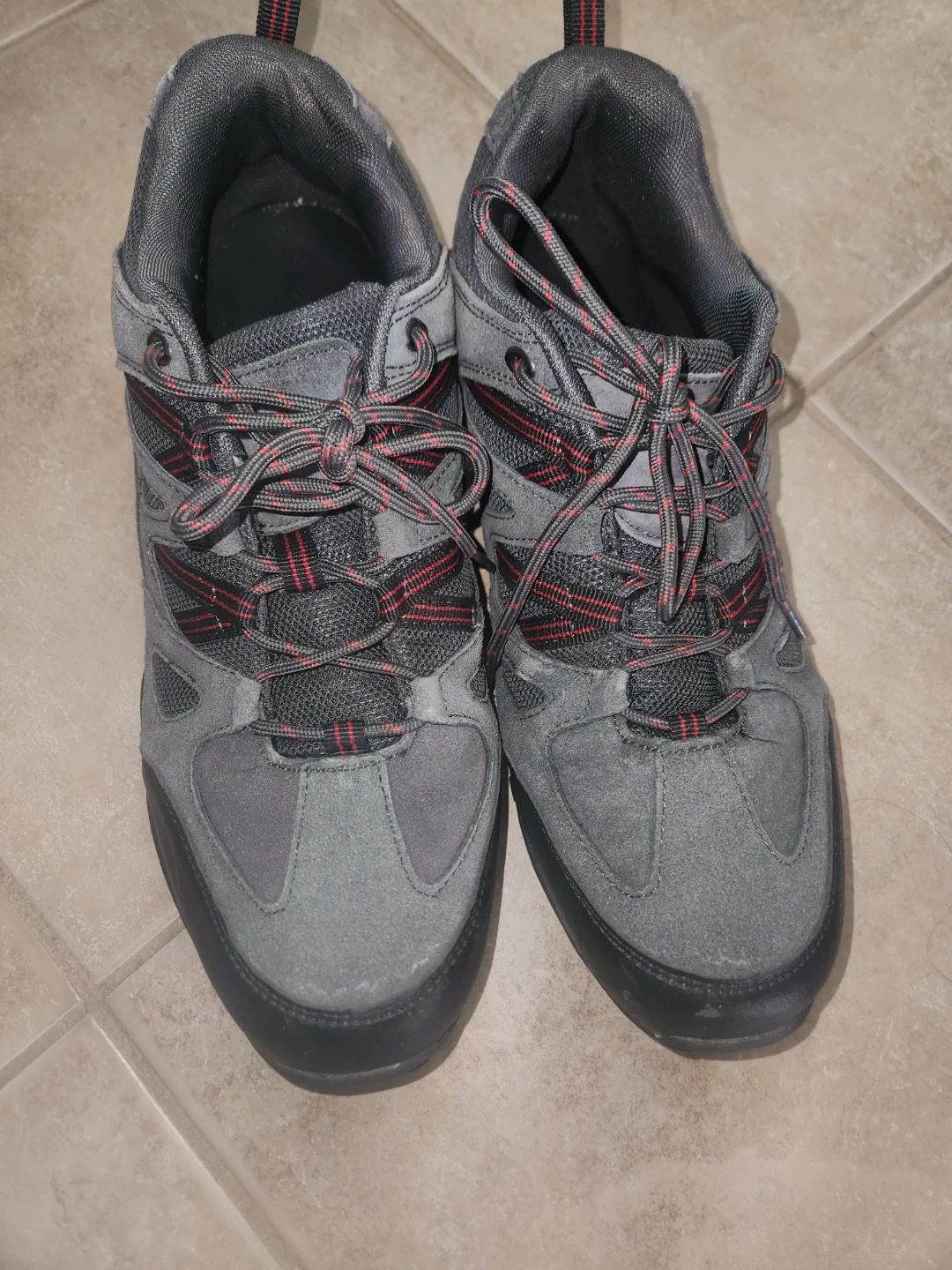 These grey mountain warehouse outdoor III shoes have red accents and laces. They feature a durable rubber sole for good grip. Suede and mesh upper construction.great for hiking or winters.I used it may be twice not more and have been sitting idle, since it's taking space and I am using my other winter shoes so considering selling it.Size US 11