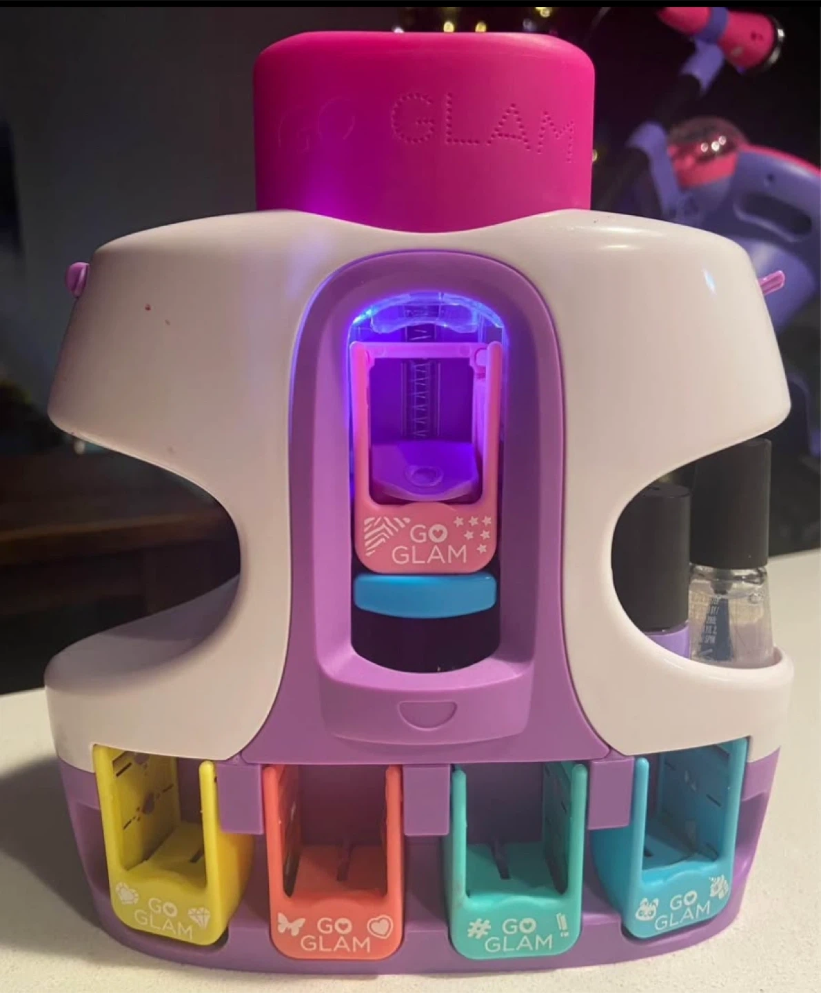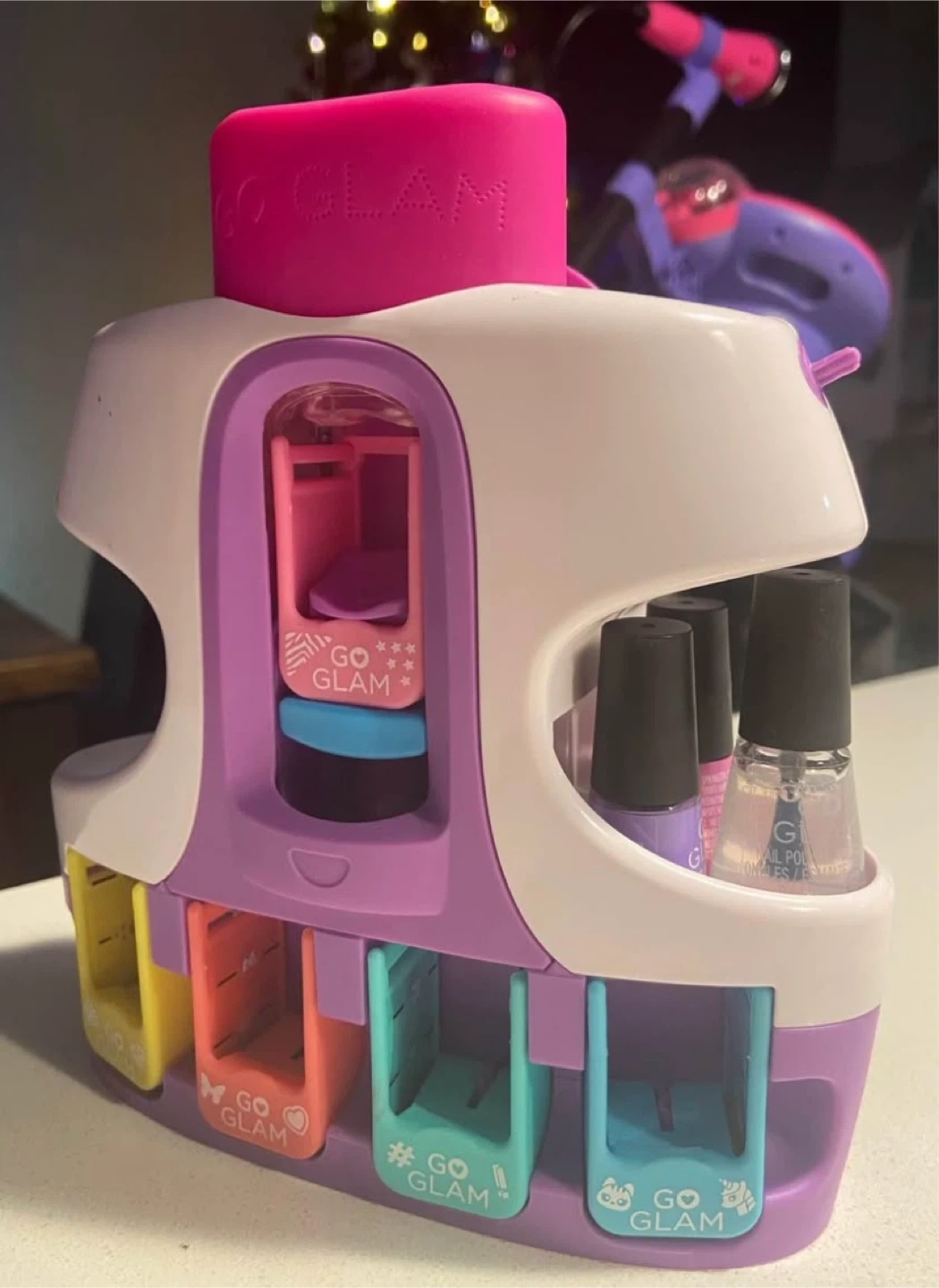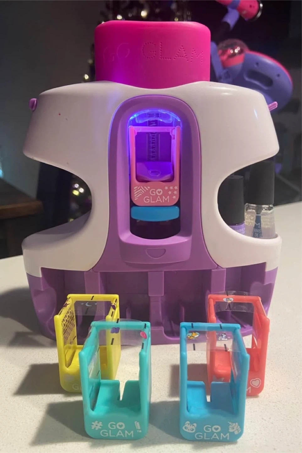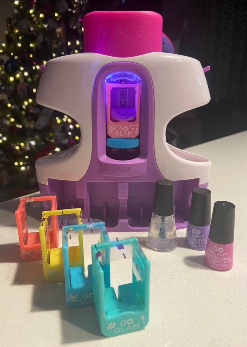 83Get ready to glam up your nails with this Go Glam Nail Stamper! It's a fun and easy way to create salon-quality manicures at home. Comes with everything you need to get started, including nail polishes and design cartridges. Perfect for kids and adults alike! Most sticker cartridges remain and mail polishes almost full