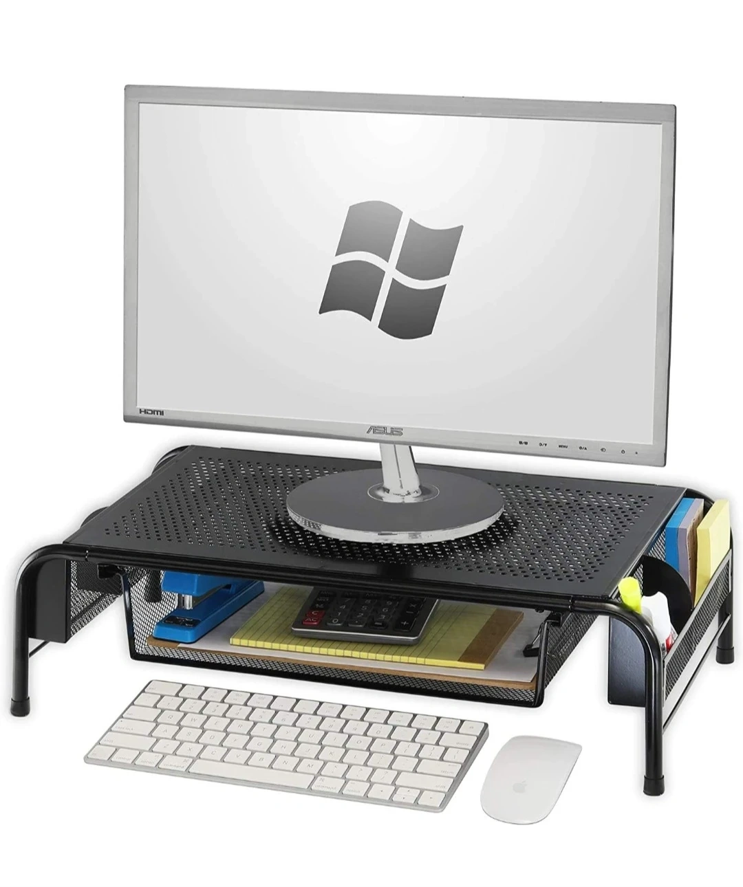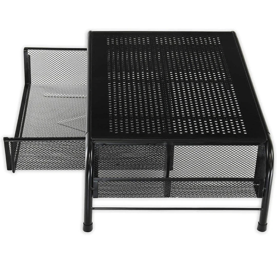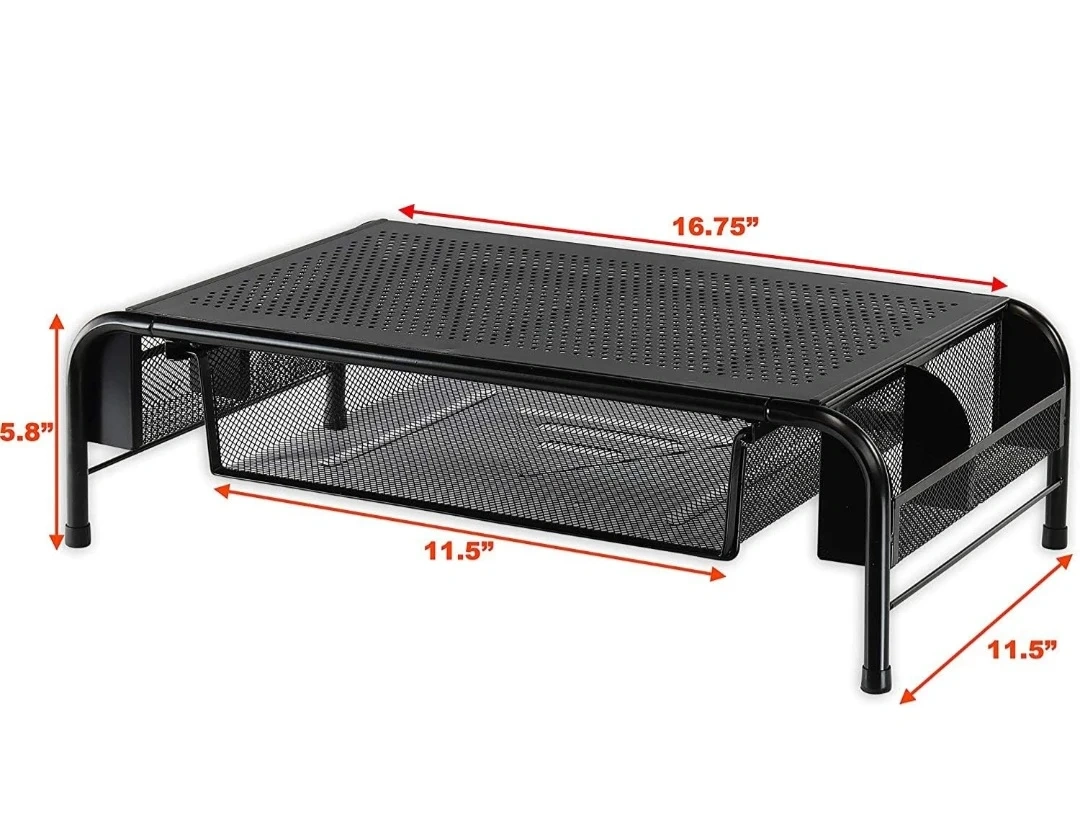 This black mesh monitor stand elevates your monitor and organizes your desk. It features a sliding drawer and side compartments for pens and other supplies. Metal mesh construction.