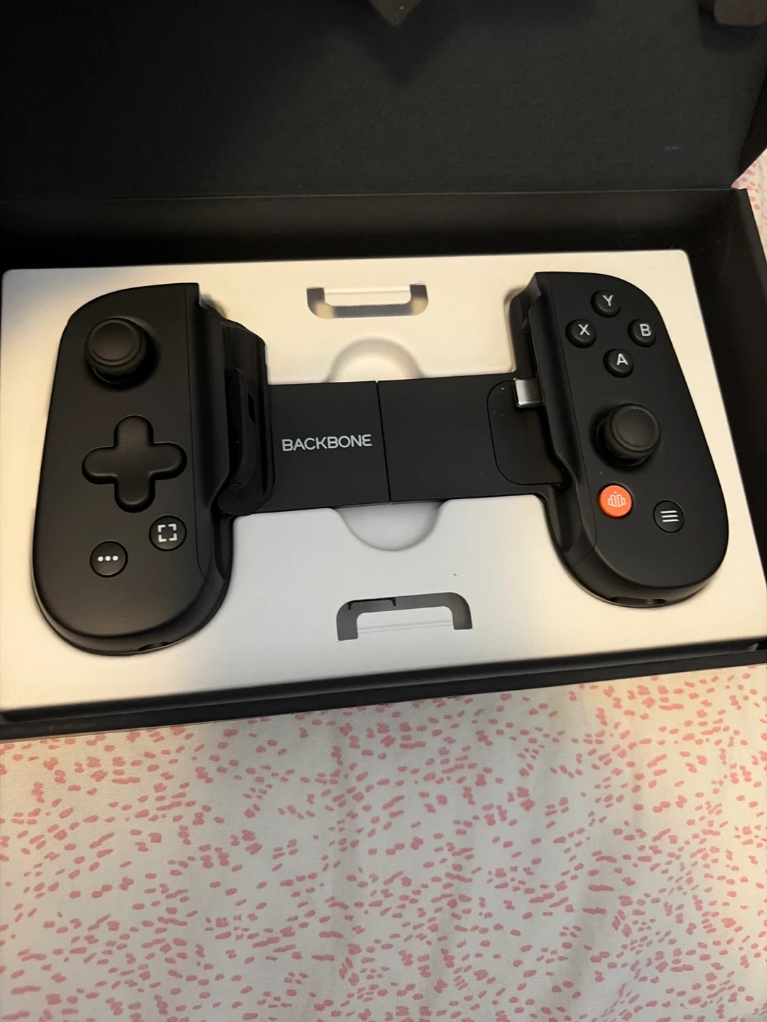 This is a Backbone One controller for iPhone. It comes with the controller itself and a small adapter. It's designed to enhance your mobile gaming experience.