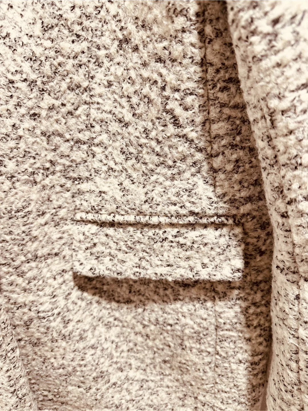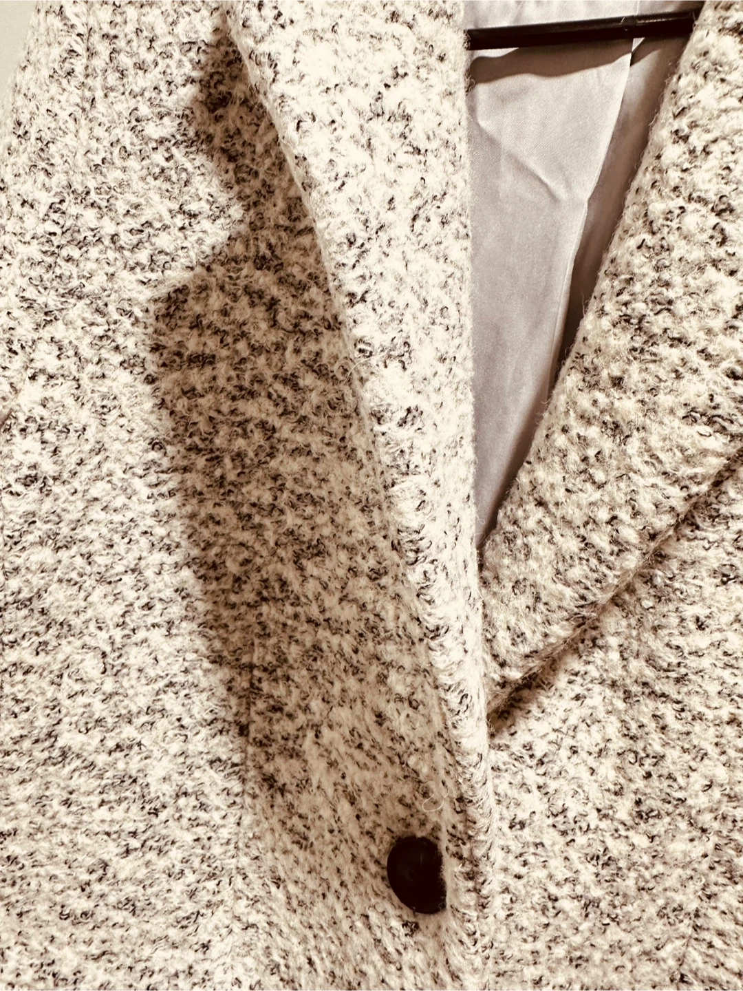 This women's tweed coat features a speckled pattern with black and white threads. It has a classic collar, button closure, and two front pockets. The interior lining is a smooth grey fabric. Perfect for cooler weather!