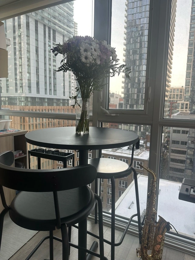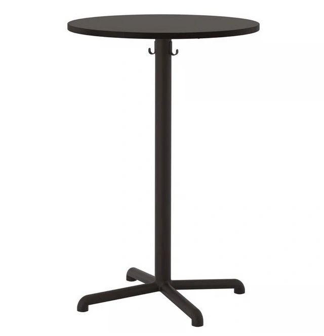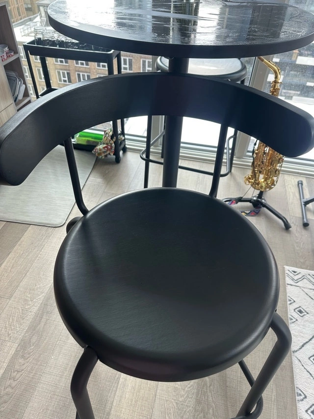 This set includes a high black table and two black chairs with backrests, perfect for a modern and minimalist space. The set is in used condition but has been well-maintained.