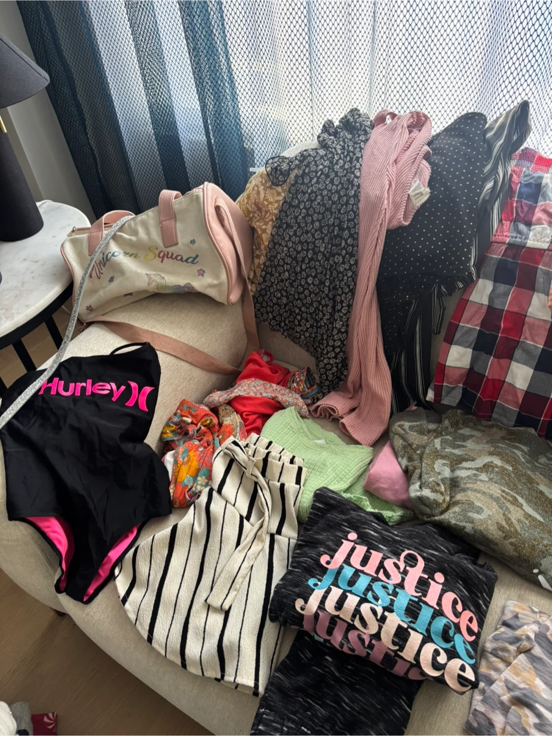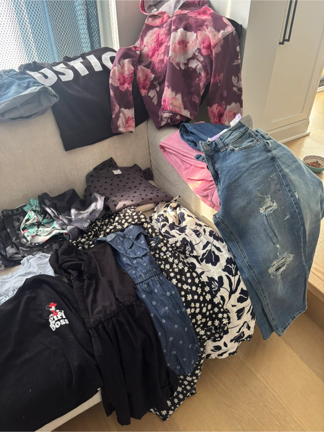 A collection of girls' clothing items including tops, dresses, jeans, and more. Various sizes and styles are included. Perfect for a kid's wardrobe refresh!