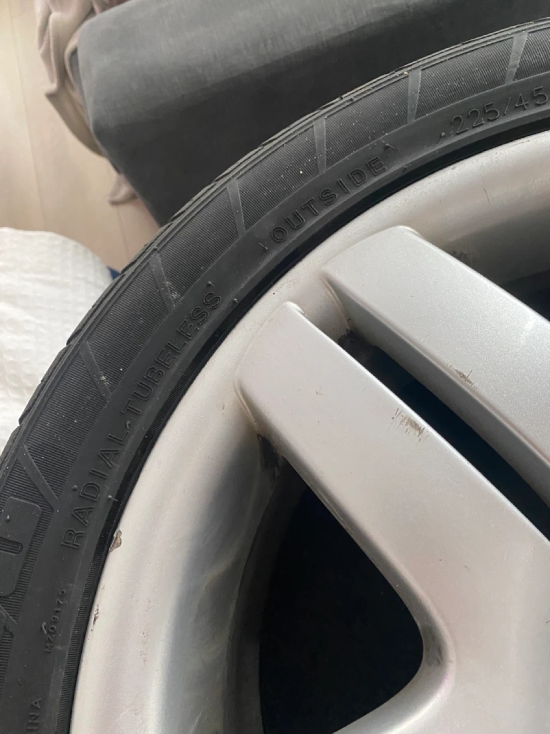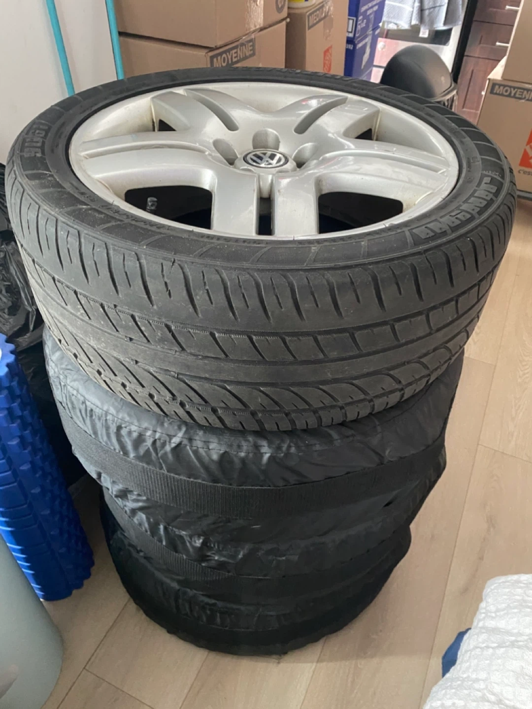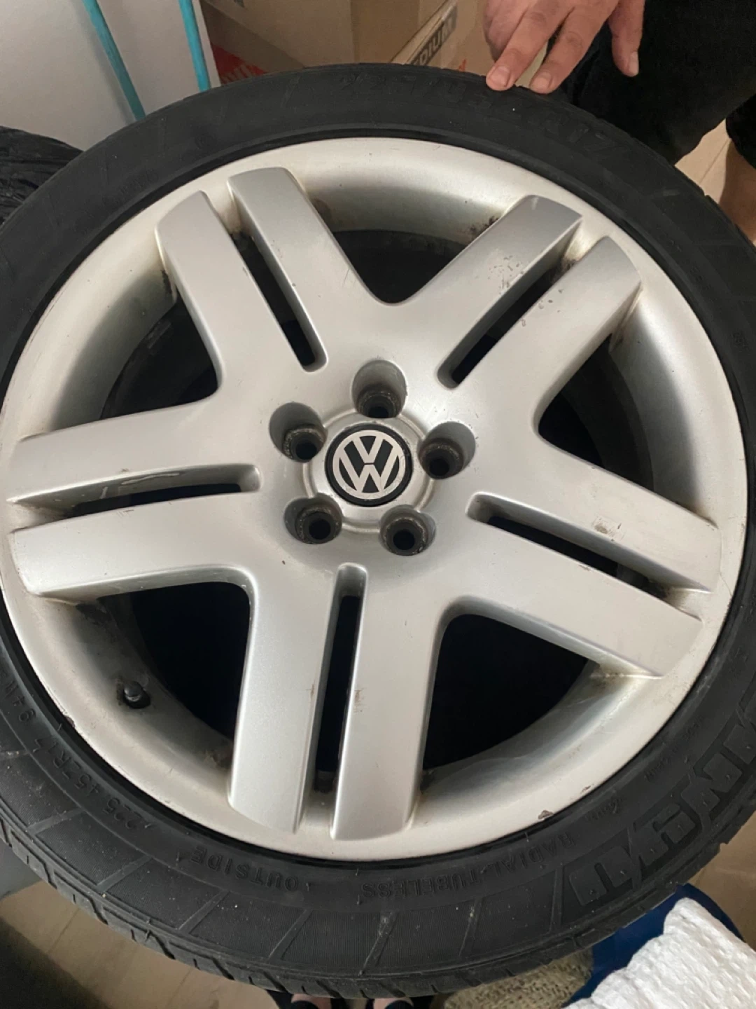 Set of four Volkswagen tires and rims. Tire size is 225/45ZR17, with a load index of 94W. Rims are silver alloy. Selling mainly for rims as-is but includes the tires.