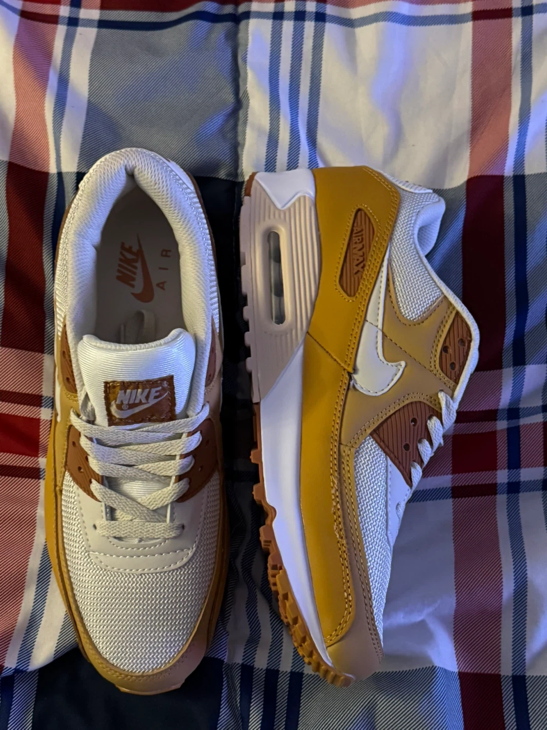 Nike Air Max 90 sneakers in a mix of white, tan, and yellow. Features the iconic Air Max cushioning. Classic athletic footwear. Men’s US size 11