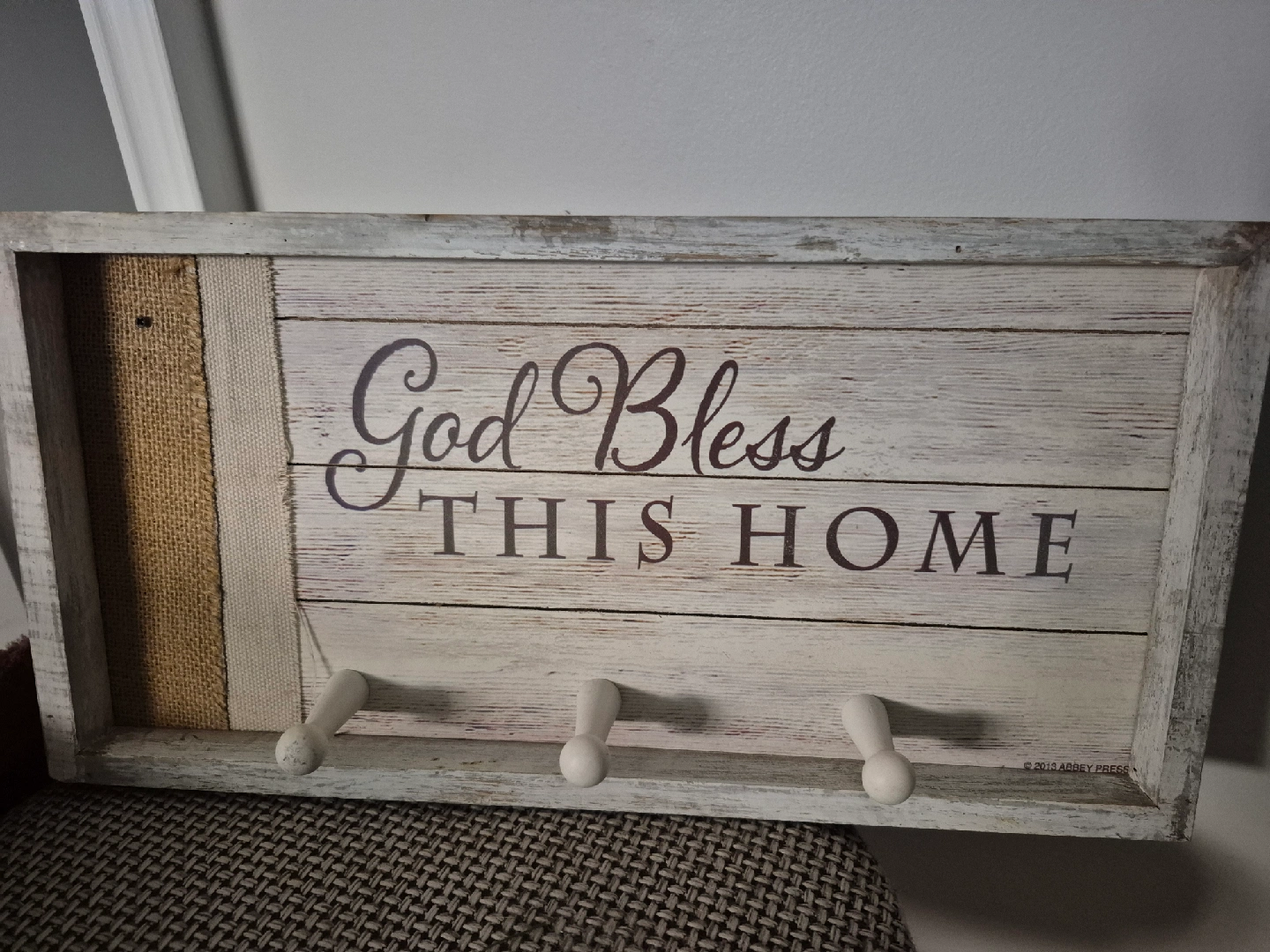 This charming wall decor features the phrase "God Bless This Home" and includes three hooks. It's perfect for adding a touch of warmth and organization to your entryway or any room in your home