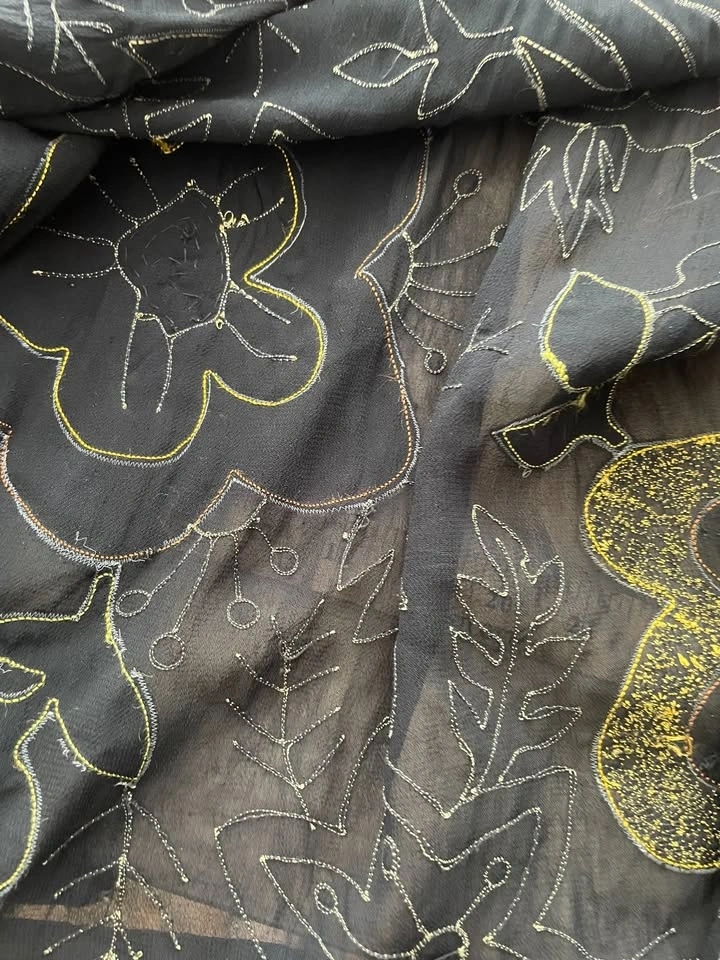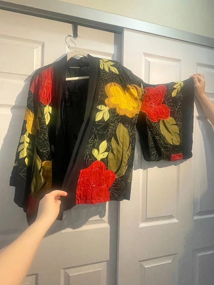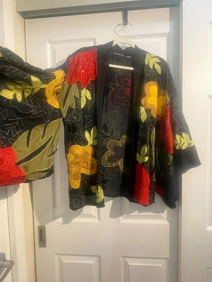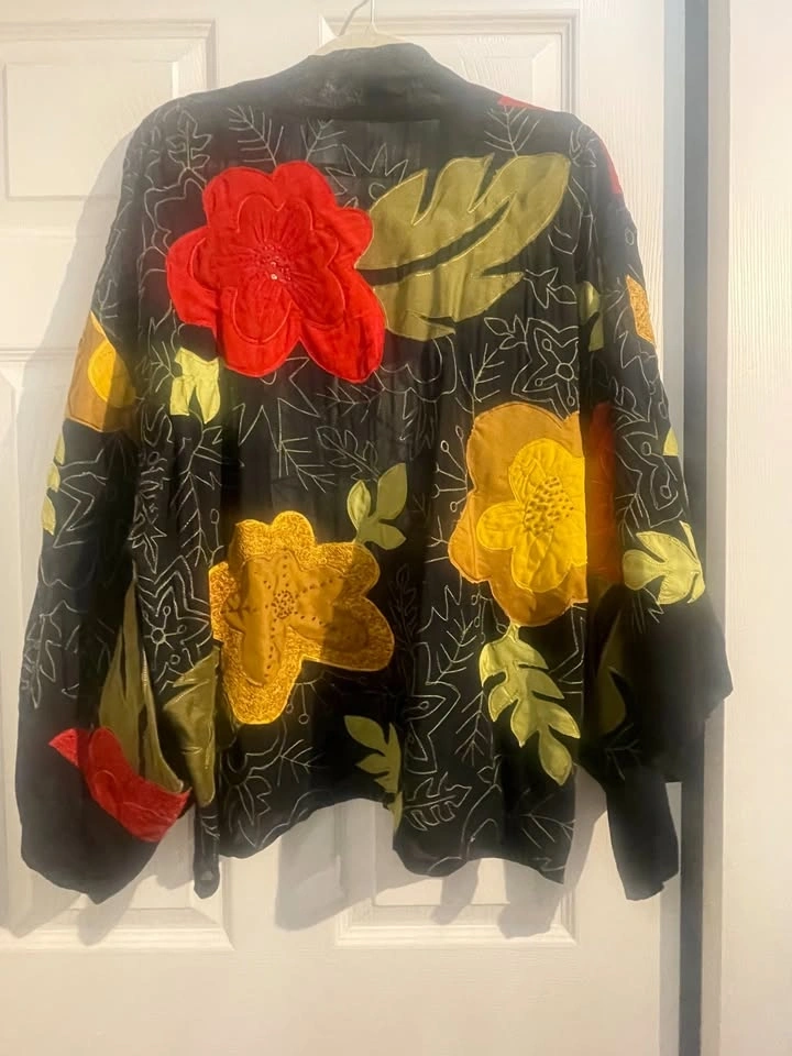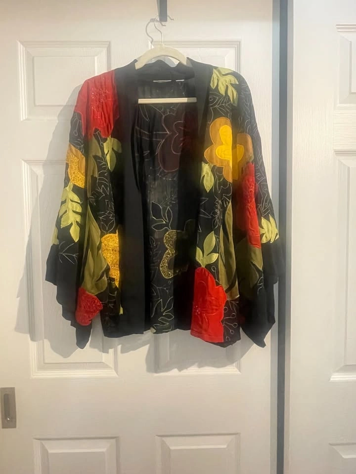 Excellent condition, worn just a few times. Very unique! It has a free-flowing design, so I'd say it fits sizes L-XXL. The label was removed, but I have a photo of it. Made from natural materials: rayon and silk. Armpit to armpit on the back is 25 inches. There's a small mark on a red flower on the back, as shown in the last picture. My main intersection is Yonge/Eglinton or Mount Pleasant/Eglinton. Please check my other listings. Let's discuss a discount if you bundle items. Thanks for looking!