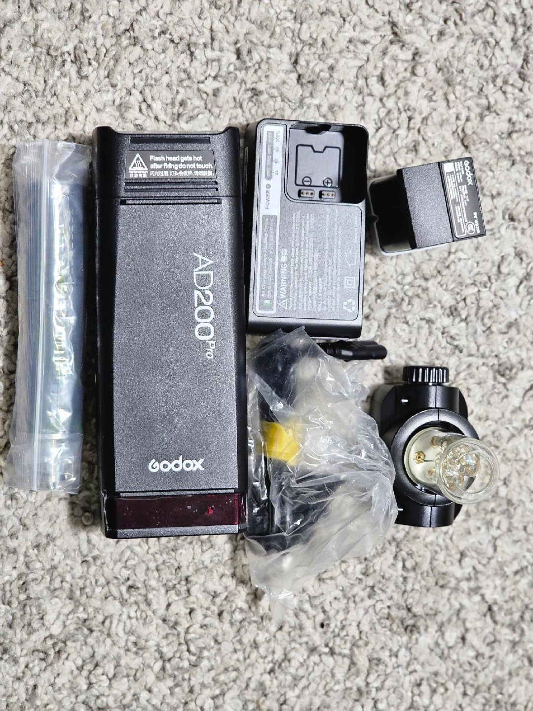 Selling a Godox AD200Pro flash strobe kit. It's in great condition and includes all the components you see in the photos. Originally price for $489. The kit includes the flash head, battery, and other accessories. Perfect for photographers looking for a reliable and powerful strobe! Open to reasonable offers — message me with your best price and let’s make a deal!