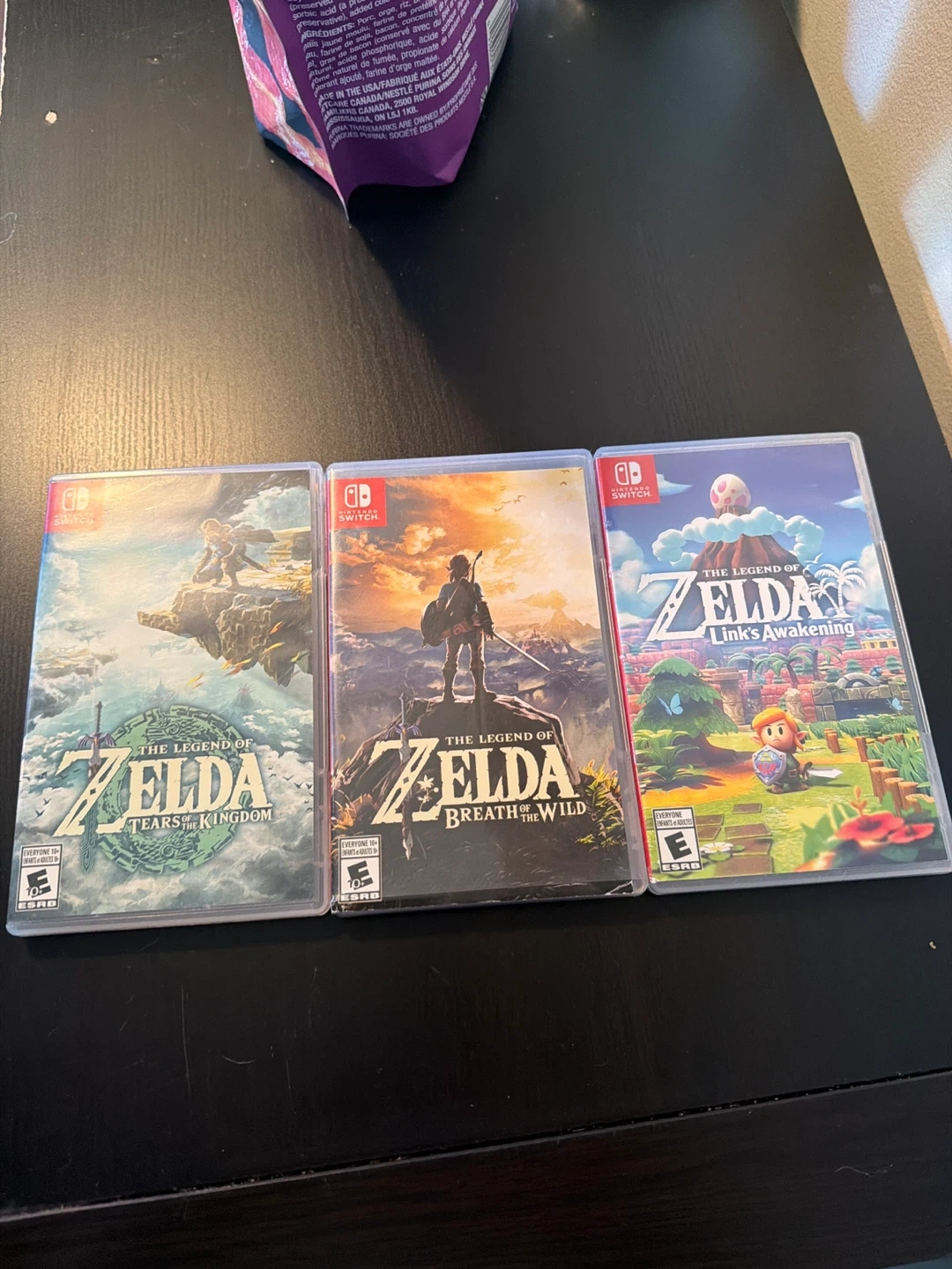 Bundle includes three Nintendo Switch games: Tears of the Kingdom, Breath of the Wild, and Link's Awakening. All games are rated E for Everyone or E10+ by ESRB. This collection offers hours of adventure for fans of the series.
