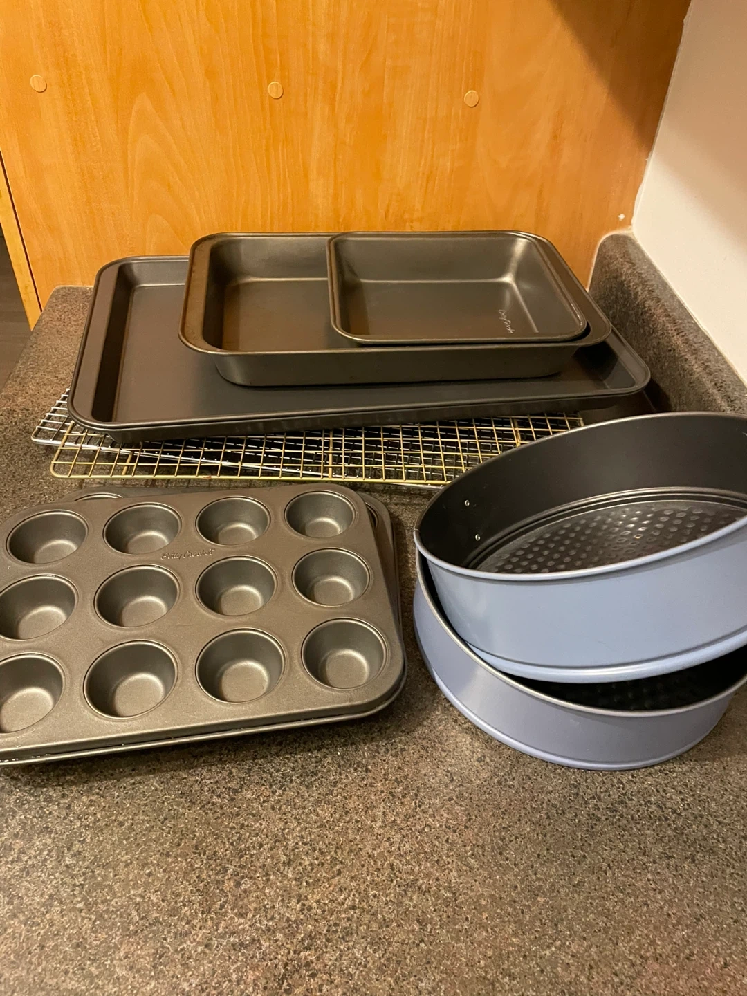 Whole set includes 2 round cake pans, 3 rectangular baking sheets, 1 square baking tin, two cooling racks, and two 12-cup mini muffin tins. Pick up only - downtown