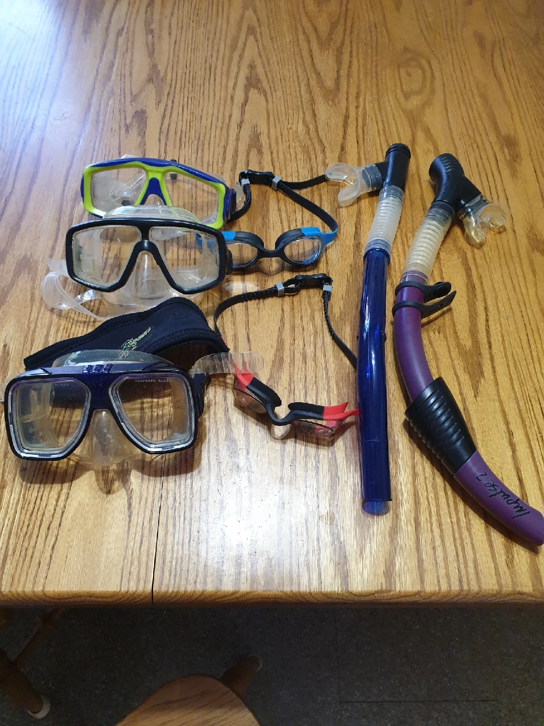 Get ready to explore the underwater world with this set of snorkeling gear. The set includes masks and snorkels, ideal for your next aquatic adventure. This set is used but still fully functional. Dive into savings and make a splash this summer! Masks come in a variety of colors. If this ad is still up, yes, it's still available! Purple snorkel $40.00 Blue snorkel $25.00 Small Google $10.00 each Blue front Mask $40.00 Black Mask $25.00 Lime green Mask $15.00 NO HOLDS FIRST PU. (Union Weber Wloo)