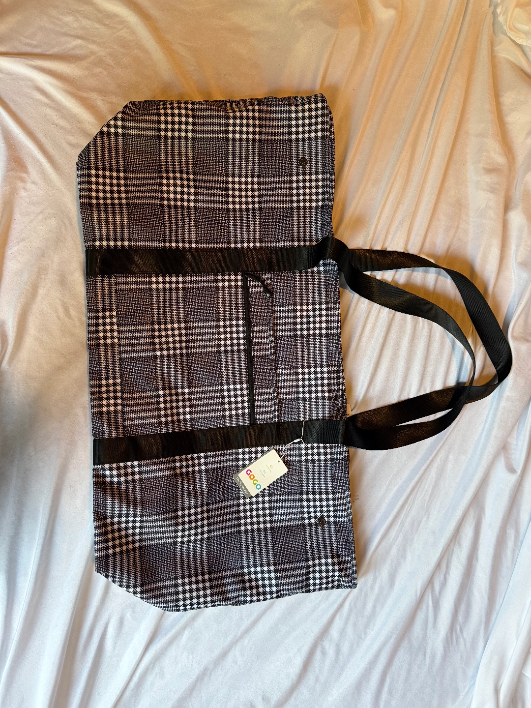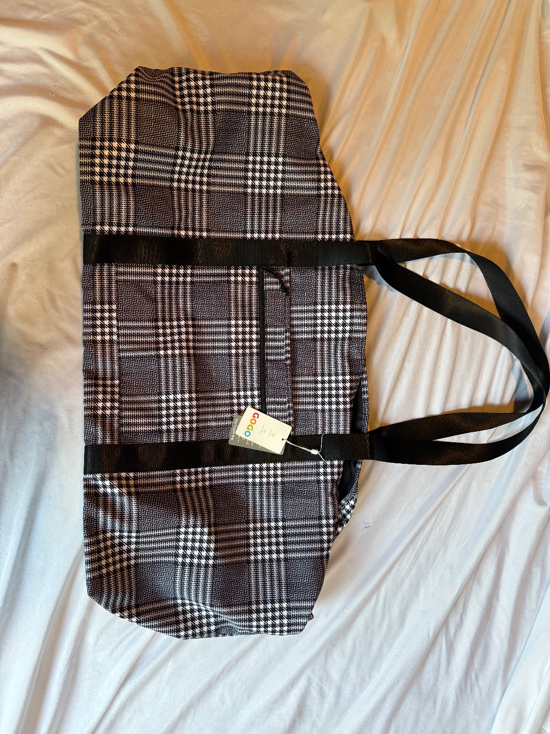Check out this new with tag GOGO Day Tripper Bag! It's a stylish tote with a classic plaid pattern. It measures approximately 32 inches in length. This bag is perfect for carrying your essentials in style!