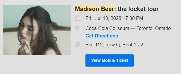 2x Madison Beer Tickets Toronto - Aisle Seats