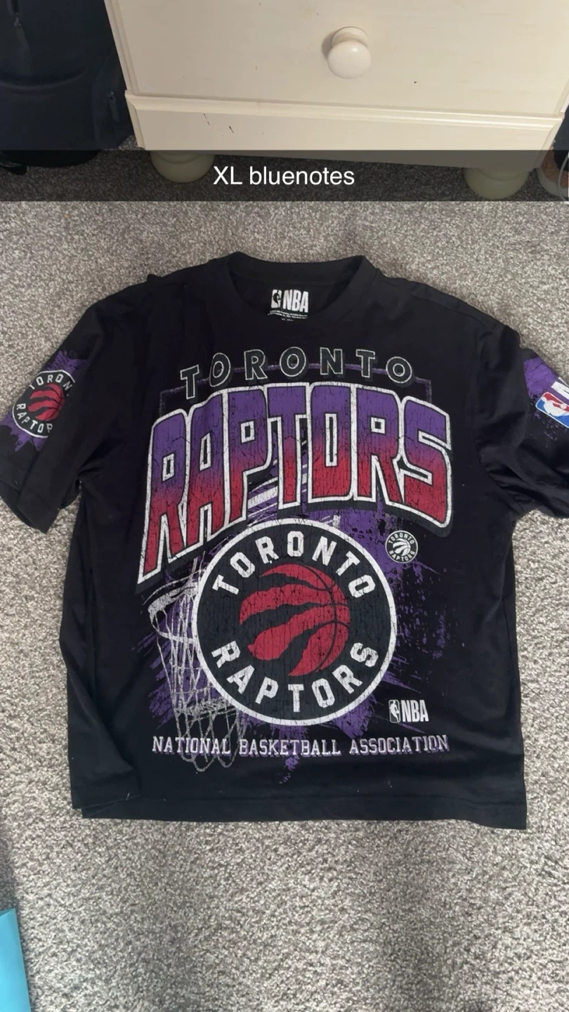 Black t-shirt featuring the Toronto Raptors logo and team name. It's a size XL. This t-shirt is great for any basketball fan!