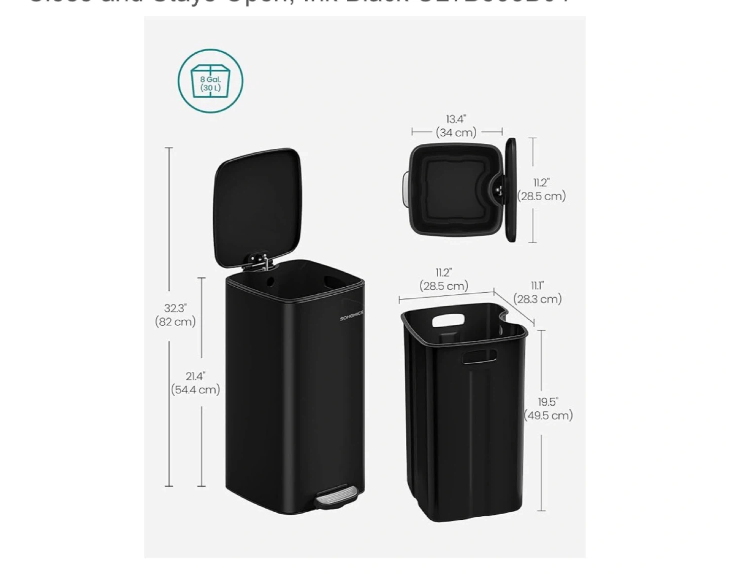 This SONGMICS trash can is black and rectangular with a foot pedal. It's 32.3" (82 cm) tall when open and has a capacity of 8 gallons (30 L). The compact design fits small spaces. This is useful for kitchens or offices.
