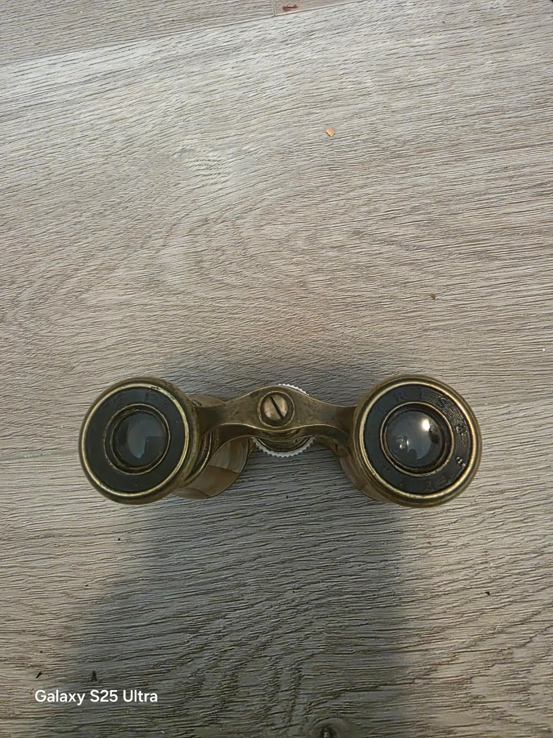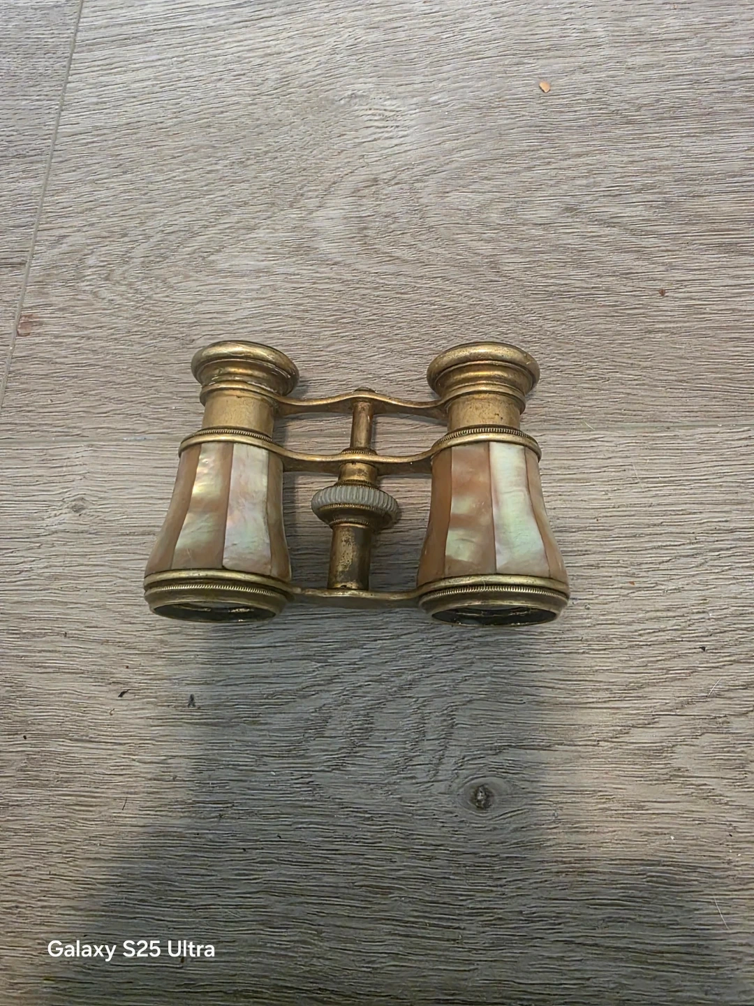 Beautiful vintage opera binoculars with a brass frame and mother of pearl inlay on the barrels. The central focus knob appears functional. These would be stunning for collectors or as a decorative piece!
