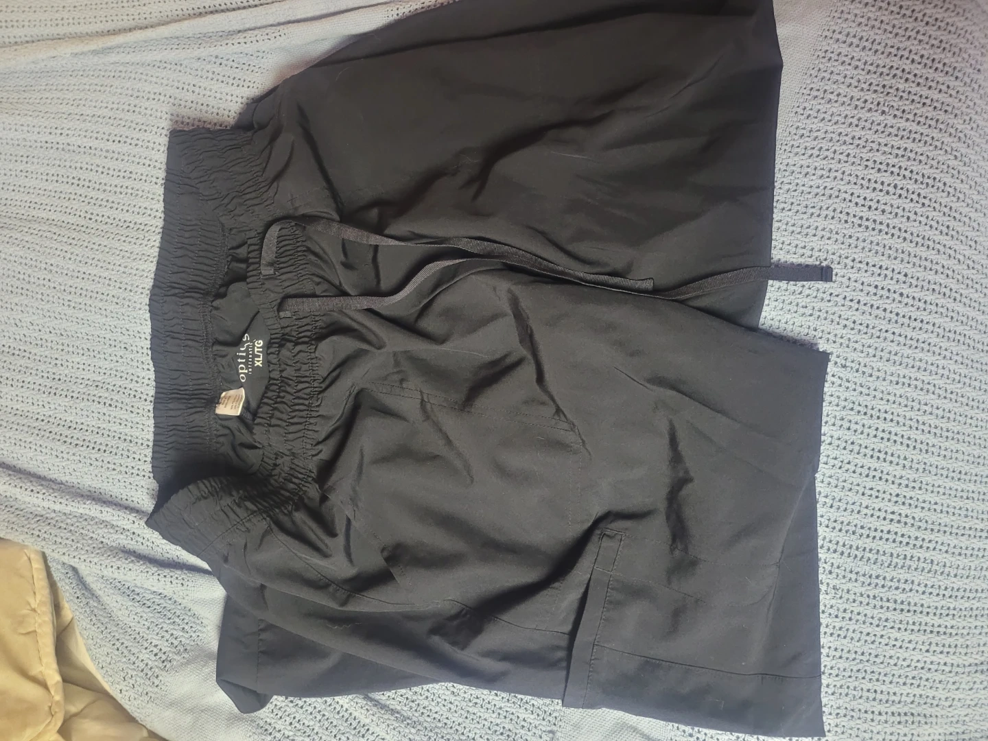 This is a set of black scrub top and pants from Options. The top is size L/G and the pants are size XL/TG. It's made of a comfortable, durable fabric. Tags removed and washed, never worn.