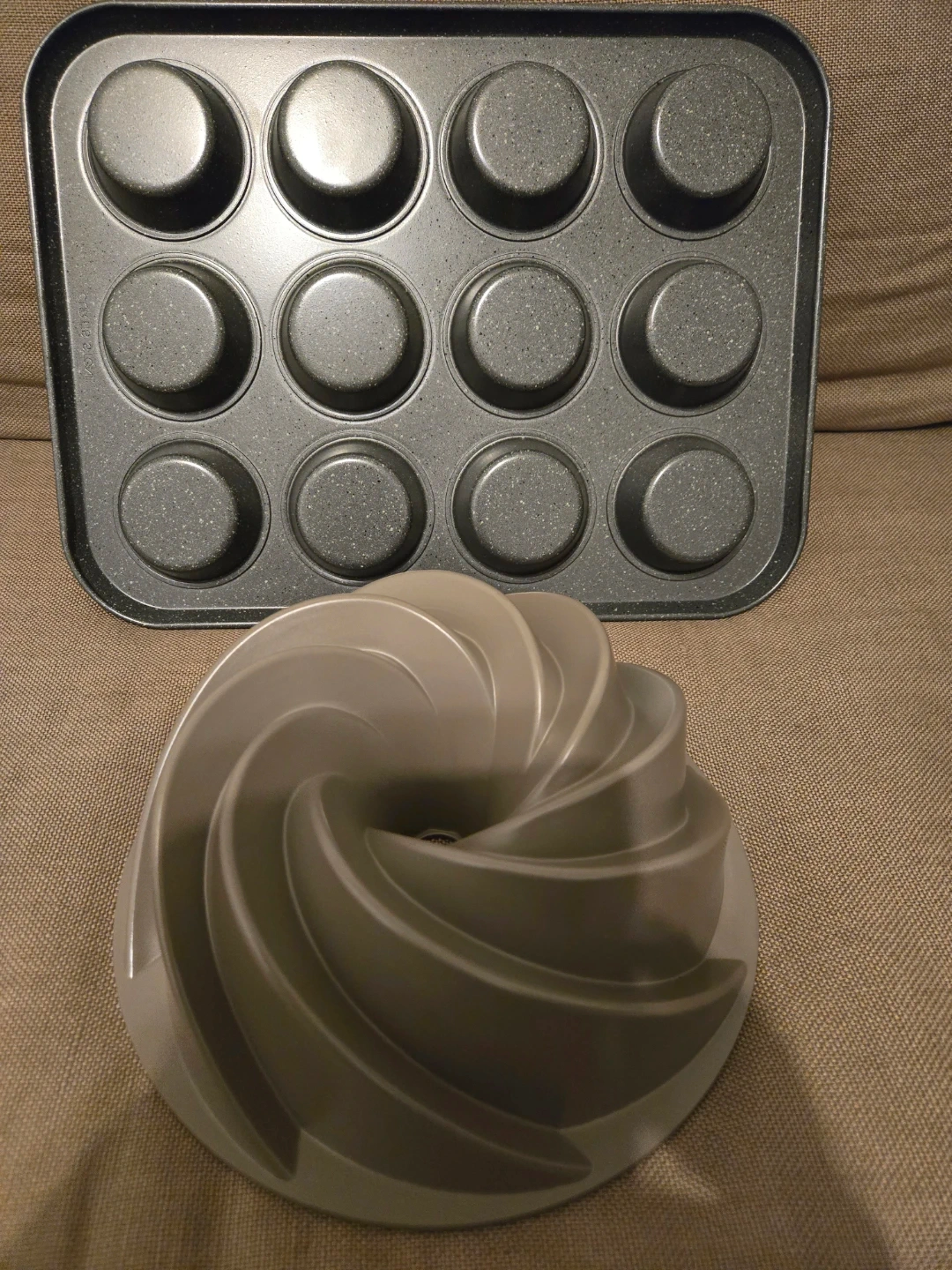 This set includes a Nordic Ware Heritage Bundt cake pan and a 12-cup muffin baking pan. Both are made of heavy metal for durable baking. They're great for making your favourite cakes and muffins!