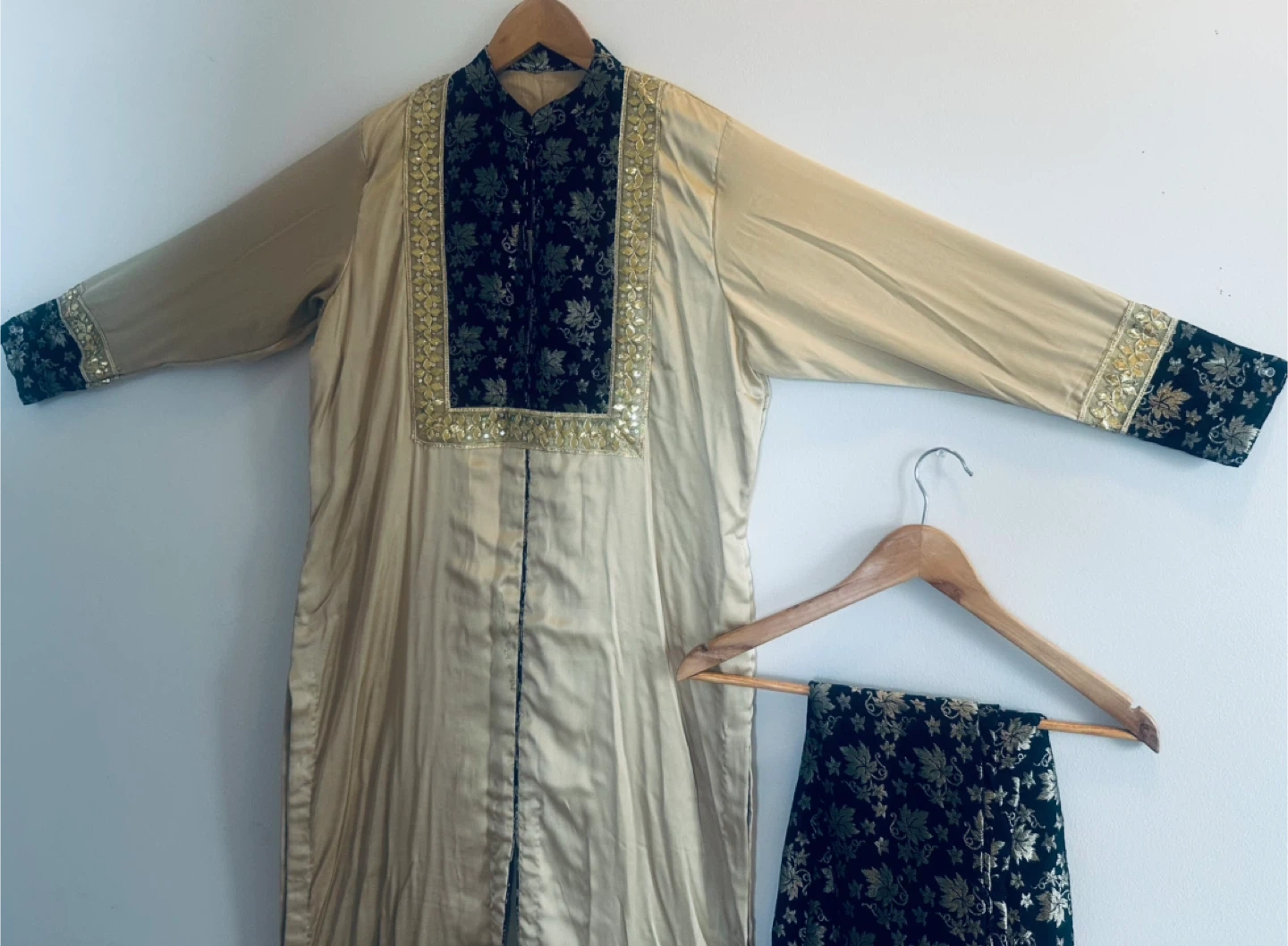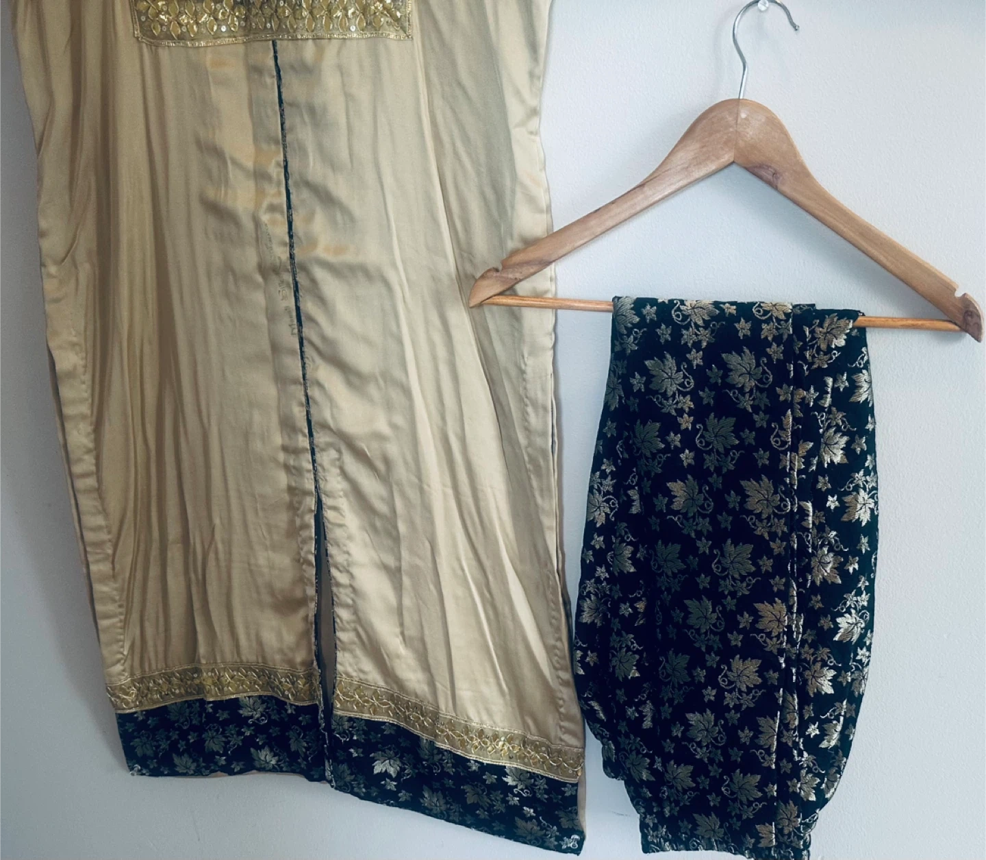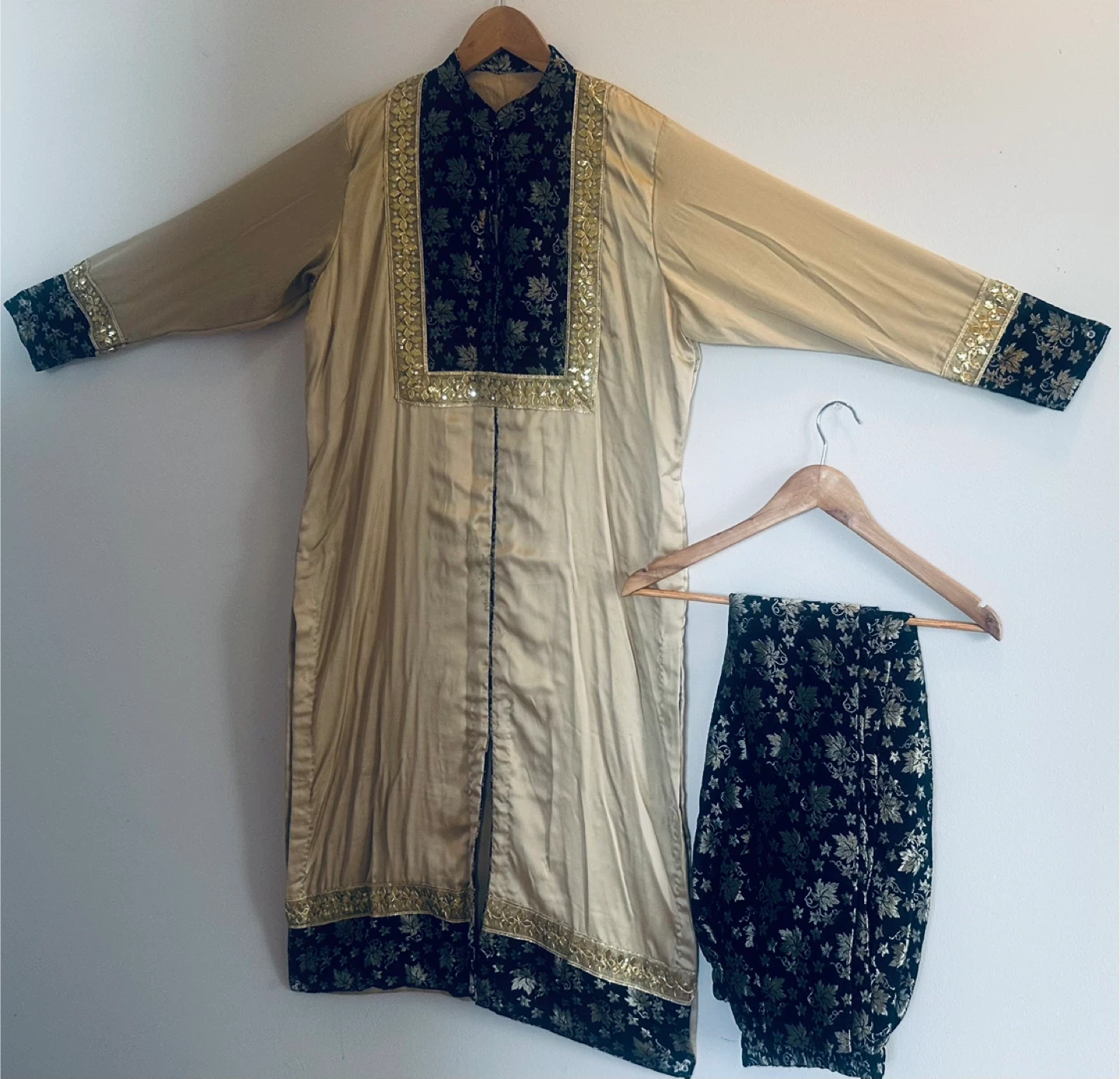 Beautiful gold shalwar kameez with black and gold detailing. Perfect for a special occasion!