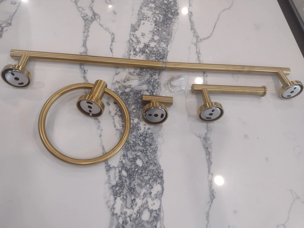 Selling a lovely gold-coloured bathroom hardware set! This set includes a towel bar, towel ring, and toilet paper holder. It's a great way to add a touch of elegance to your bathroom