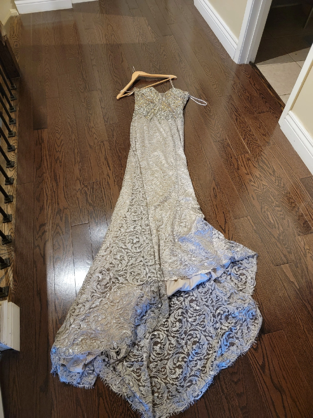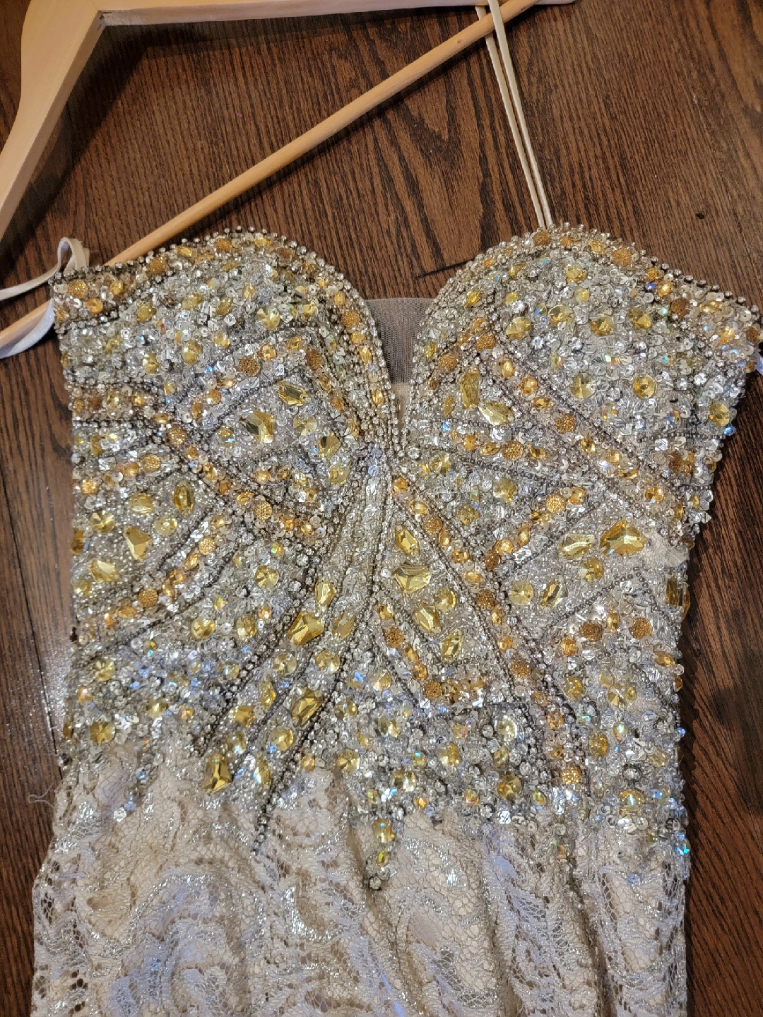 10Gorgeous golden lace dress, perfect for a formal event! The dress features beautiful embellishments on the bodice and a flowing lace skirt. It's in good condition and ready to wear for your special occasion. ( the dress was teared from one small side down the tail ) original price was 1800$