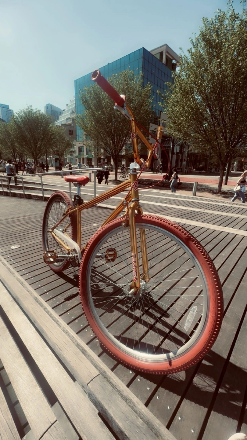 Here's a gold bicycle with red tires. It has red handle grips and seat. The frame is gold, the tires are red. You can enjoy a nice leisurely bike ride with this item, maybe around the park.