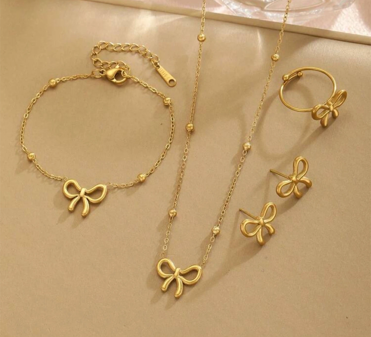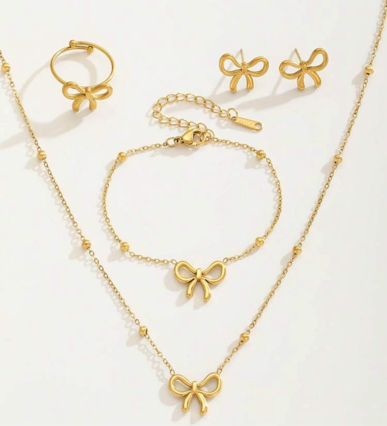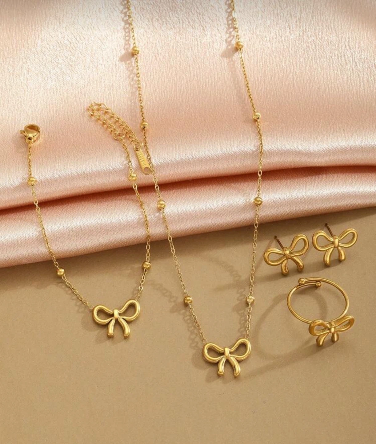56Selling a cute gold-toned jewelry set featuring a bow design! The set includes a necklace, bracelet, ring, and a pair of earrings. Perfect for adding a touch of elegance to any outfit!