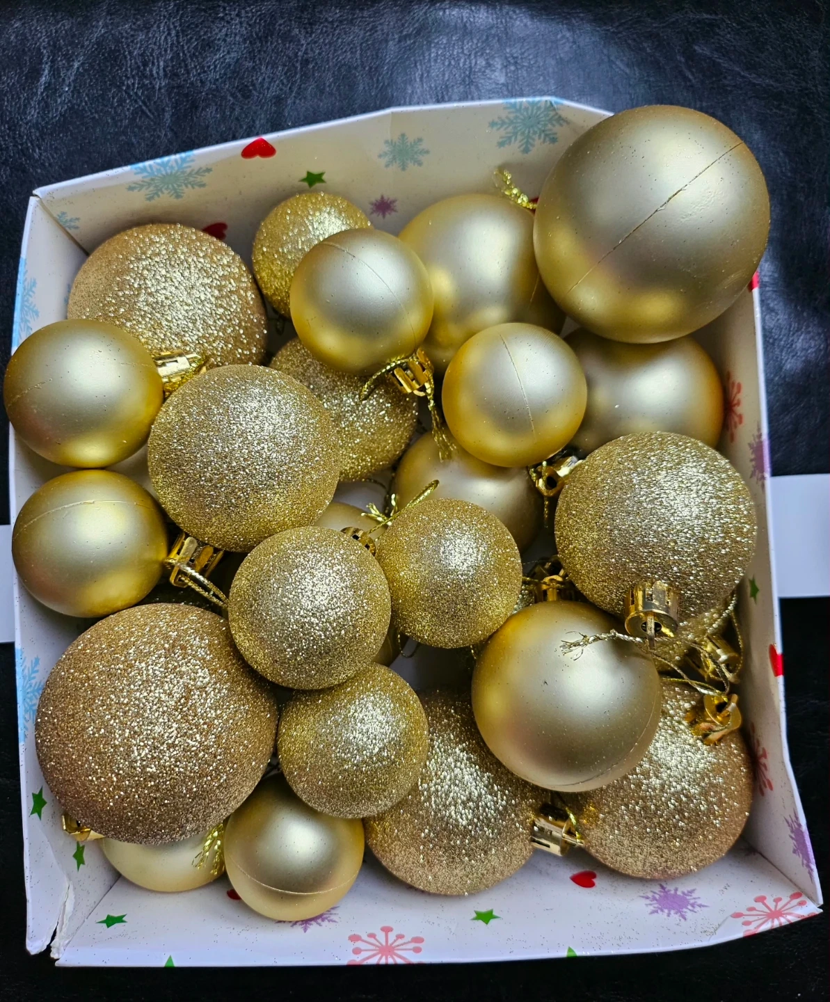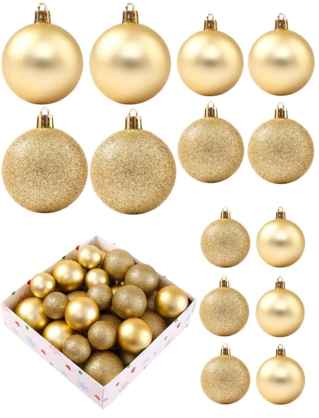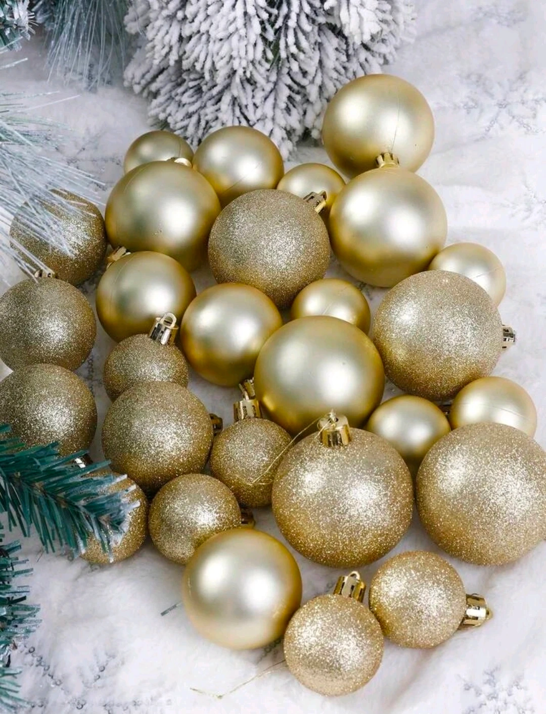Get your home ready for the holiday season with these gorgeous golden Christmas tree ornaments!There are a variety of finishes, including glitter and matte. They add a touch of elegance and sparkle to any tree. 🌟 Condition: Brand New 🌟 Quantity: 28 beautiful ornaments 🌟 Price: $20