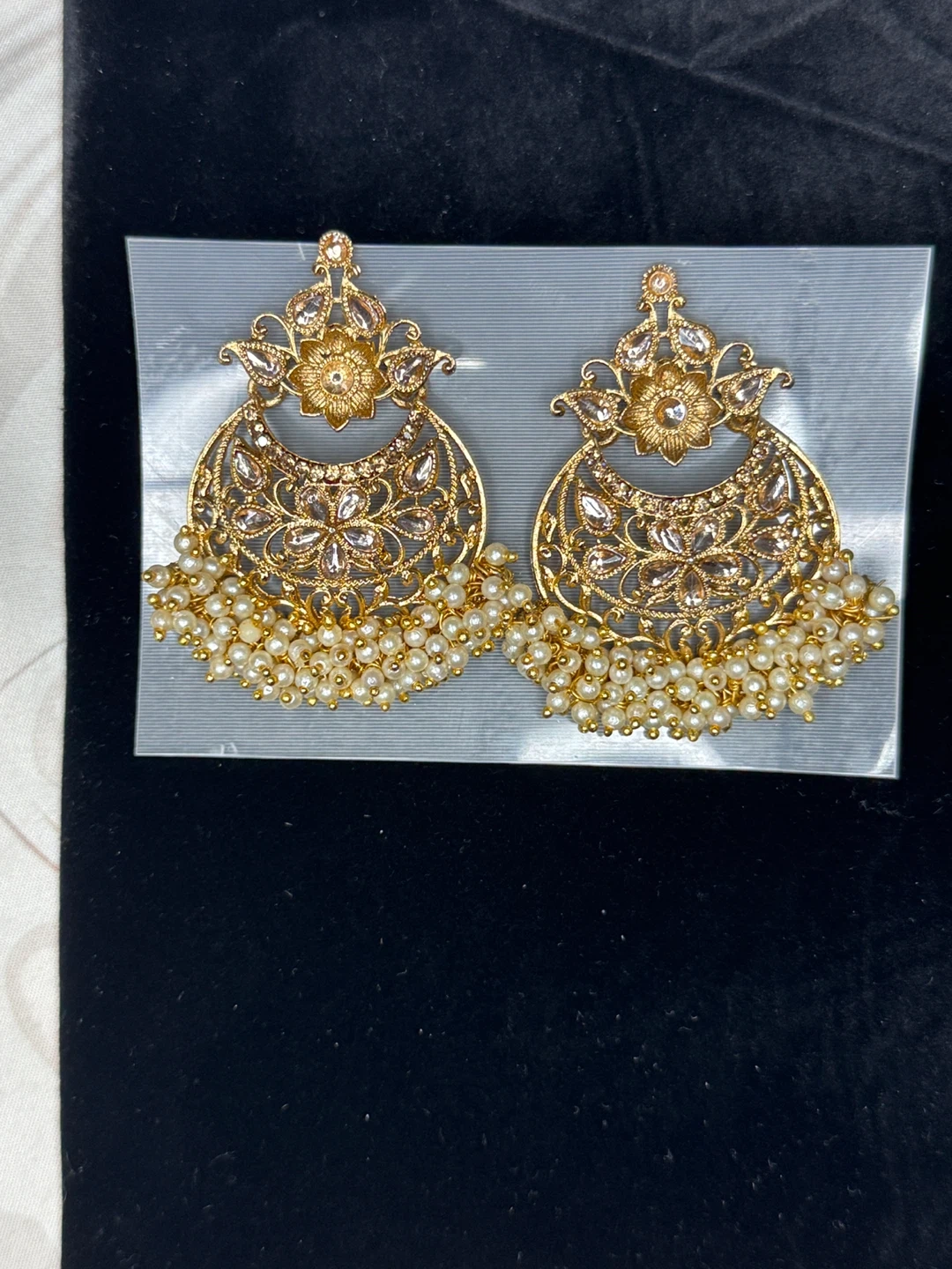 These are gold coloured earrings with a flower design and pearl details. They are in great condition and ready to wear!