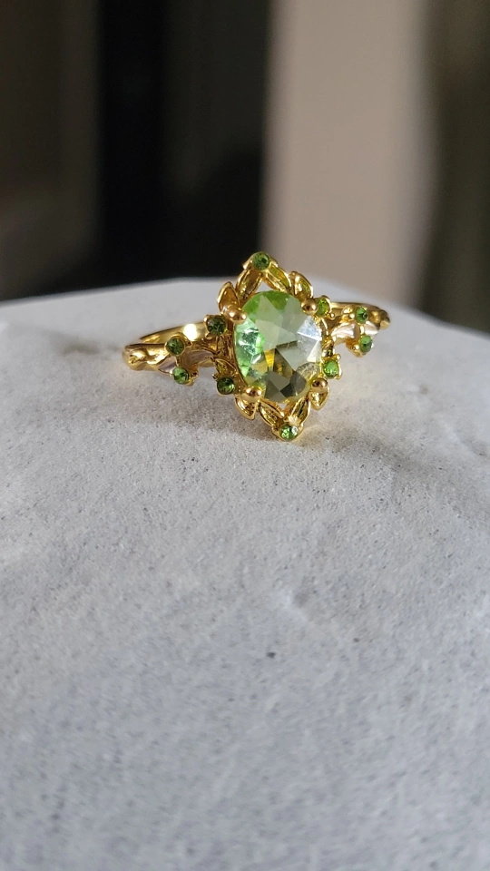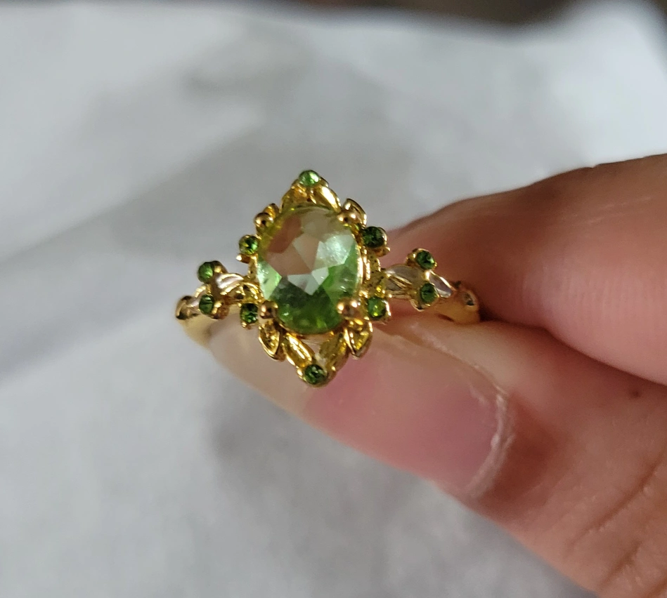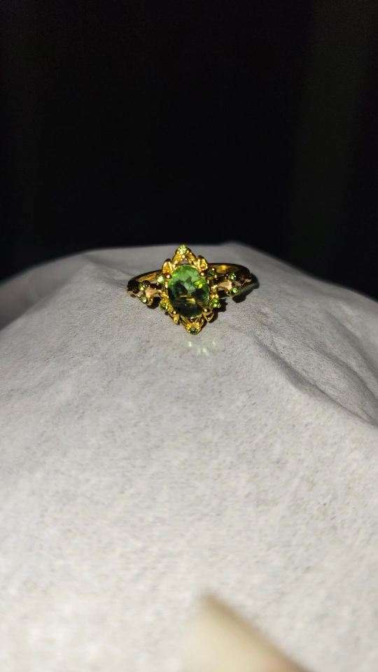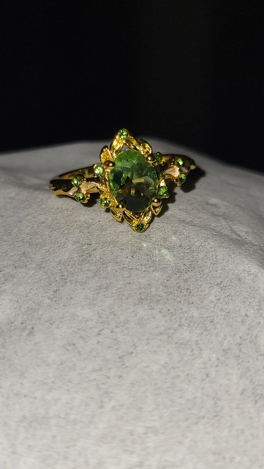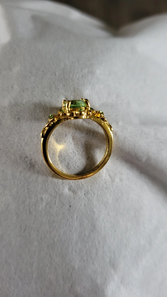 I'm selling a beautiful gold-coloured ring. Oval green stone at the centre. Smaller green stones around the edges. emerald cut cubic zirconia