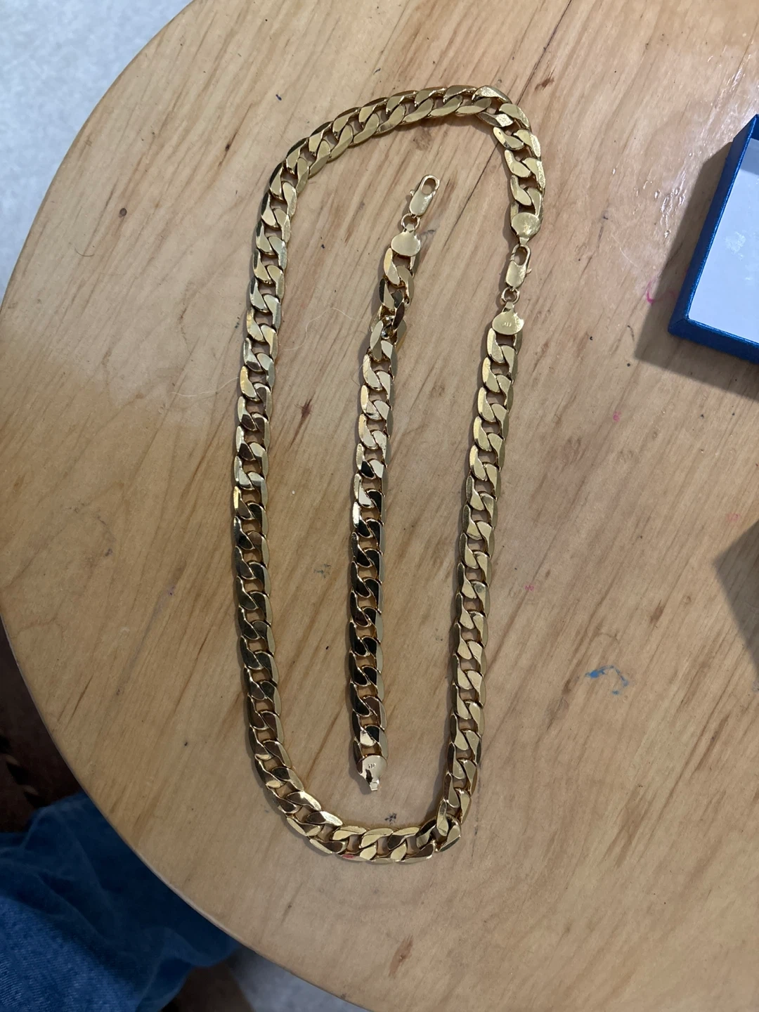 28Selling a gold Cuban link chain necklace and bracelet. It's in great condition and comes in a box, this is faux gold. Brand new and never worn. Bracelet is 8 1/4” and chain is 23 1/2”.